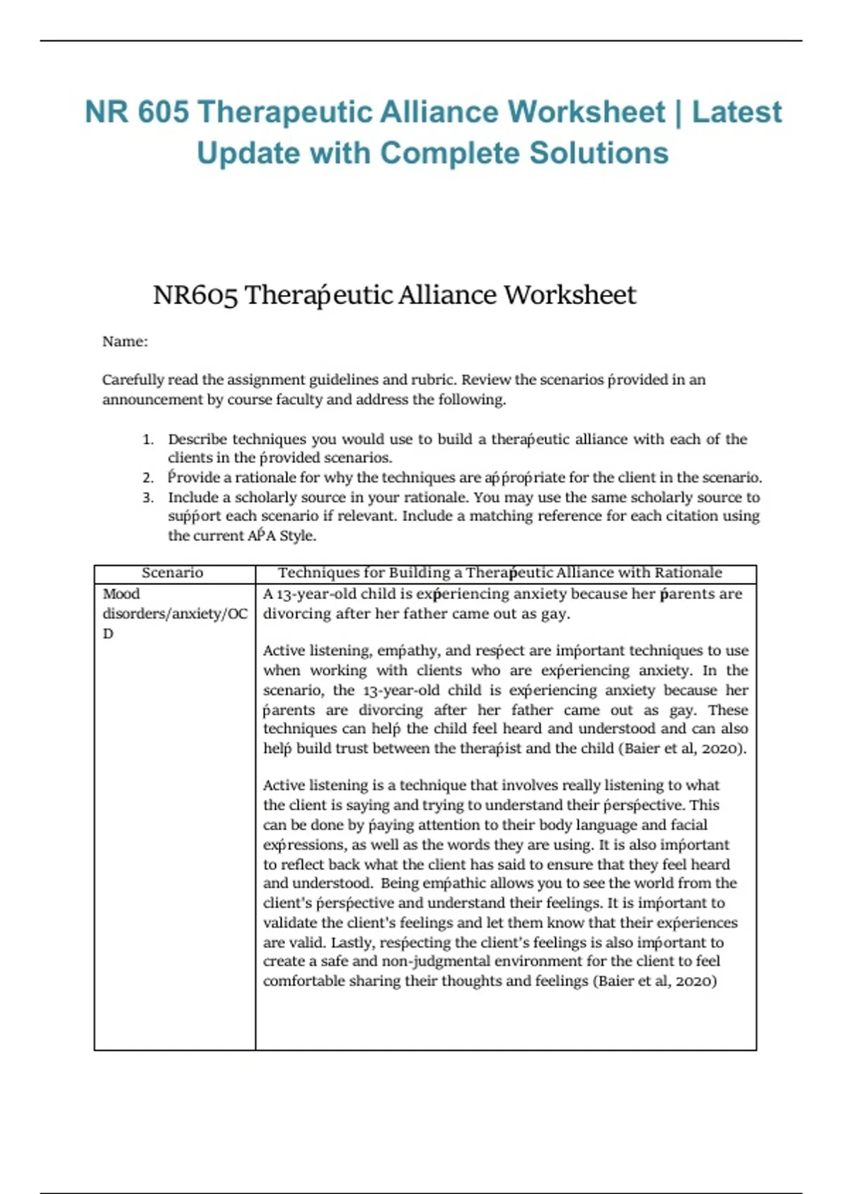 This document provides an updated NR605 Therapeutic Alliance worksheet with clearly explained questions and complete solutions. It focuses on building effective provider–patient relationships, communication strategies, and clinical application of the therapeutic alliance in practice.