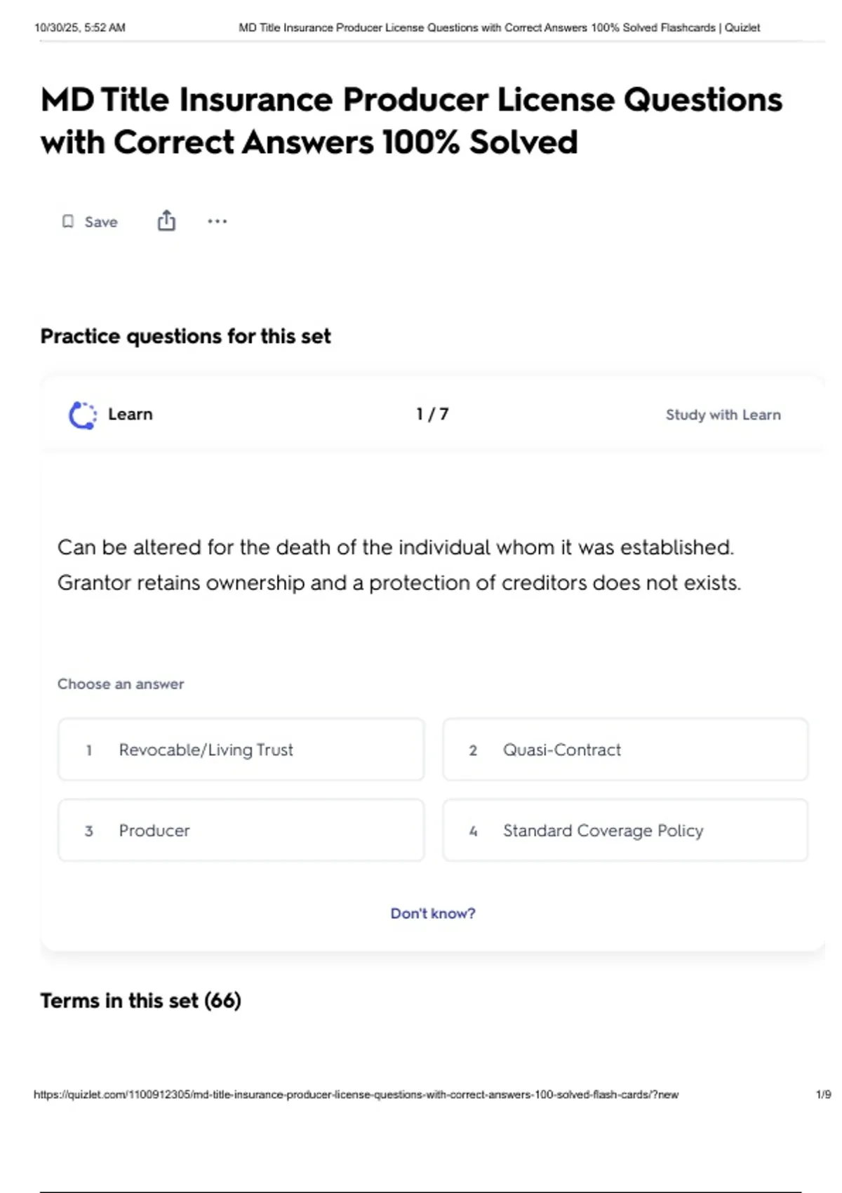 , 10/30/25, 5:52 AM MD Title Insurance Producer License Questions with Correct Answers 100% Solved Flashcards | Quizlet