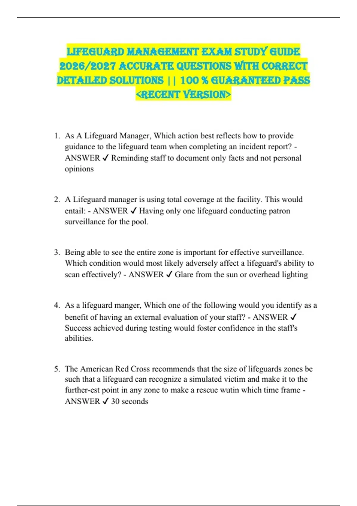 Lifeguard Management EXAM STUDY GUIDE 2026/2027 ACCURATE QUESTIONS WITH CORRECT DETAILED SOLUTIONS || 100 % GUARANTEED PASS RECENT VERSION
