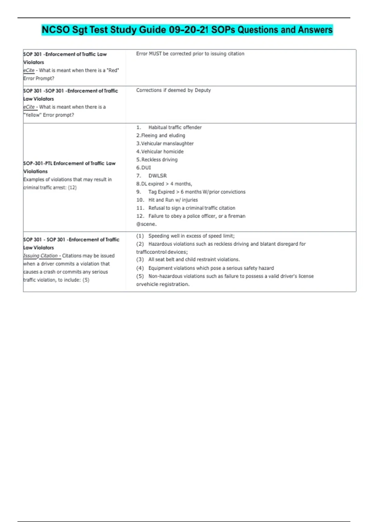 NCSO Sgt Test Study Guide 09-20-21 SOPs Questions and Answers