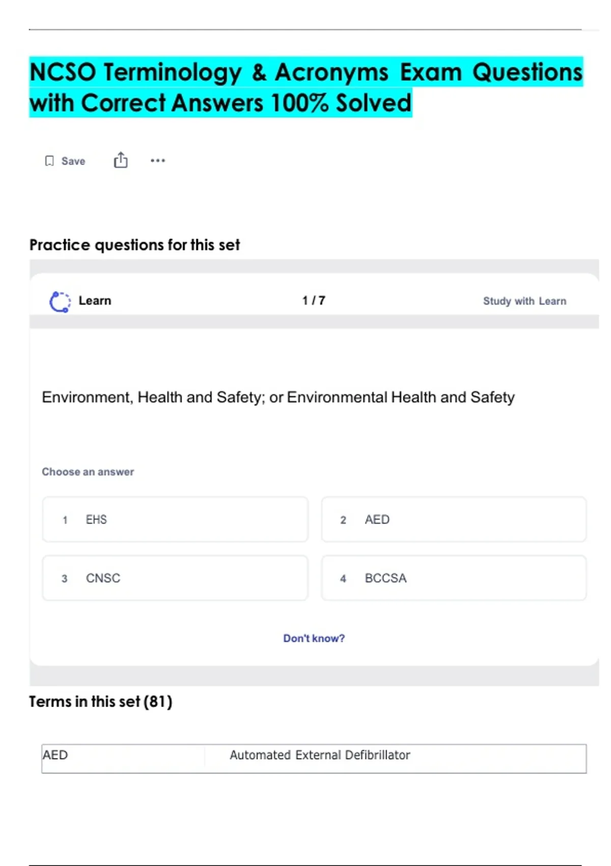 NCSO Terminology & Acronyms Exam Questions with Correct Answers 100% Solved