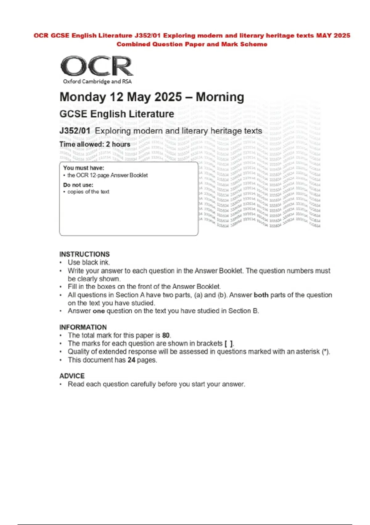 OCR GCSE English Literature J352/01 Exploring modern and literary heritage texts MAY 2025 Combined Question Paper and Mark Scheme