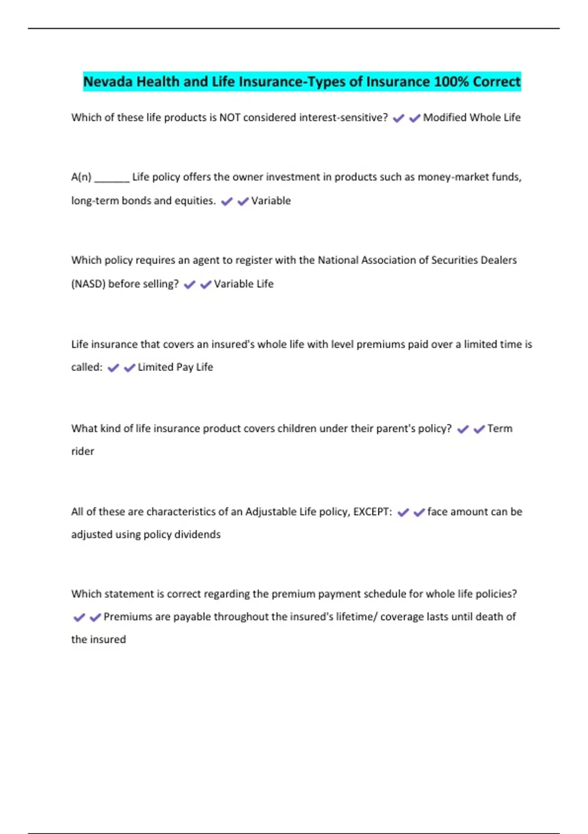 Nevada Health and Life Insurance-Types of Insurance 100% Correct