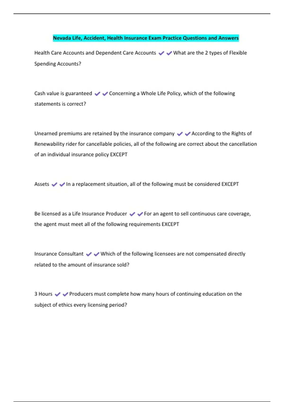 Nevada Life, Accident, Health Insurance Exam Practice Questions and Answers