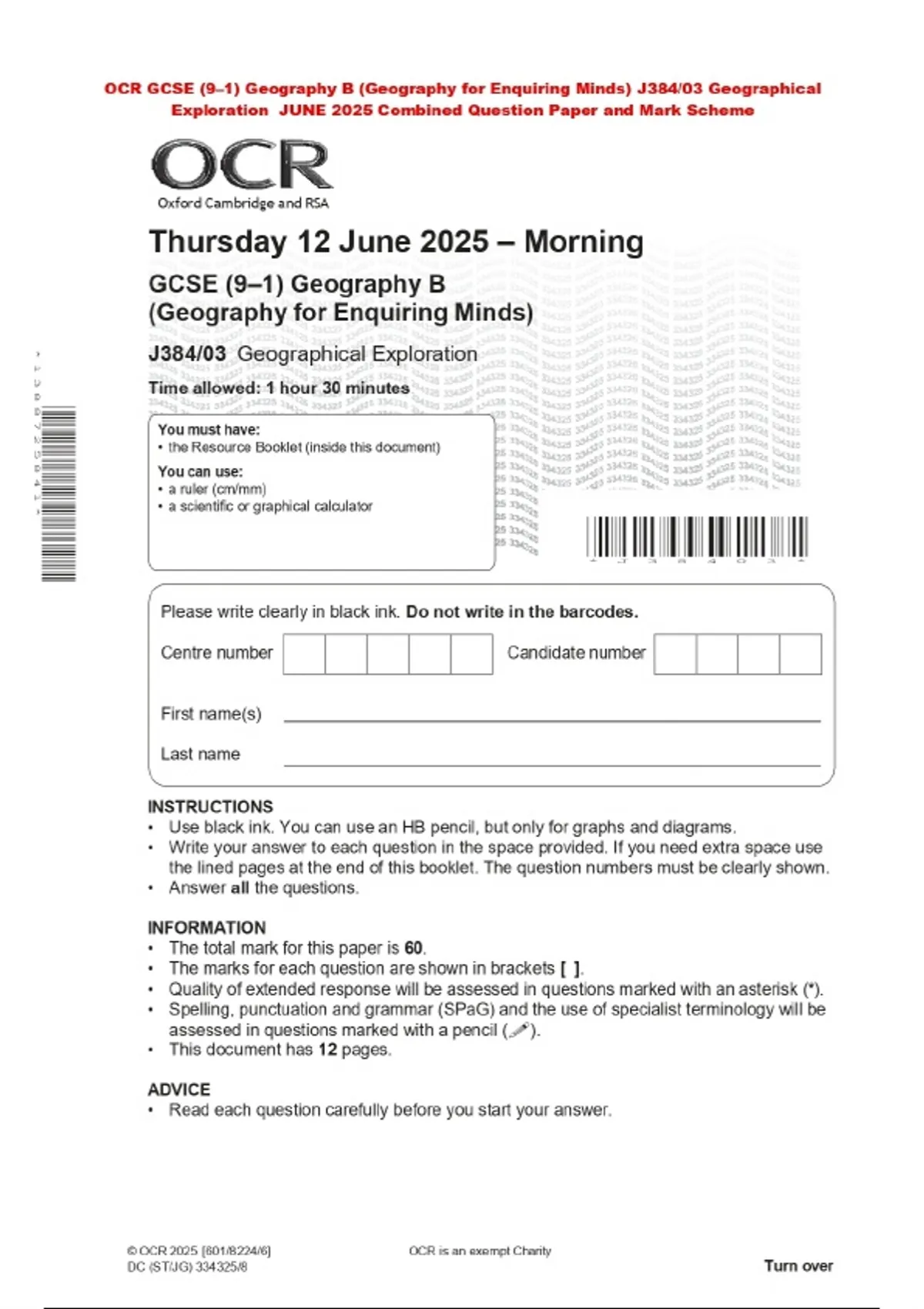PACKAGE DEAL::: : OCR GCSE (9–1) Geography 2025 Merged Question Paper and Final Mark scheme