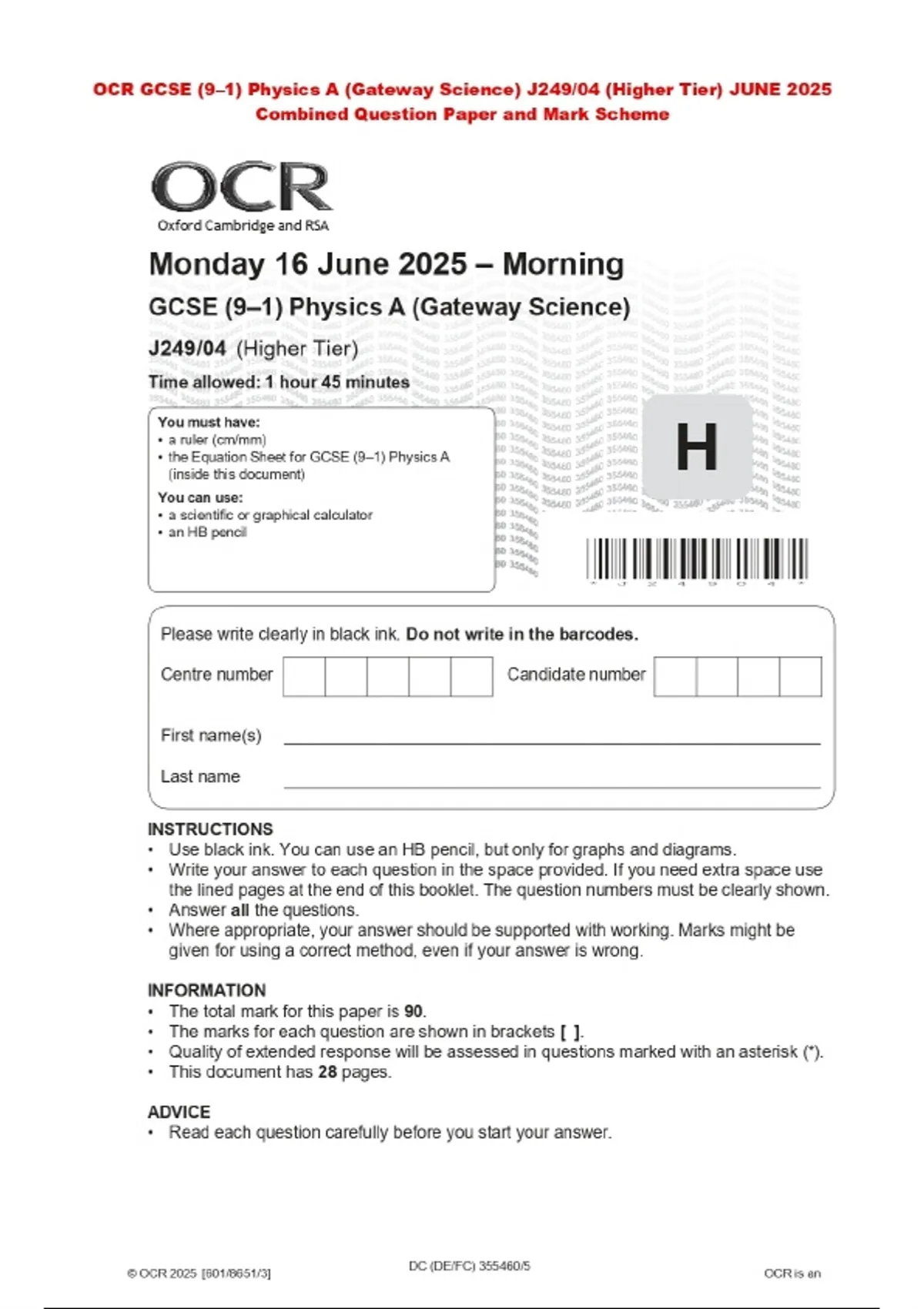 OCR GCSE (9–1) Physics A (Gateway Science) J249/04 (Higher Tier) JUNE 2025 Combined Question Paper and Mark Scheme