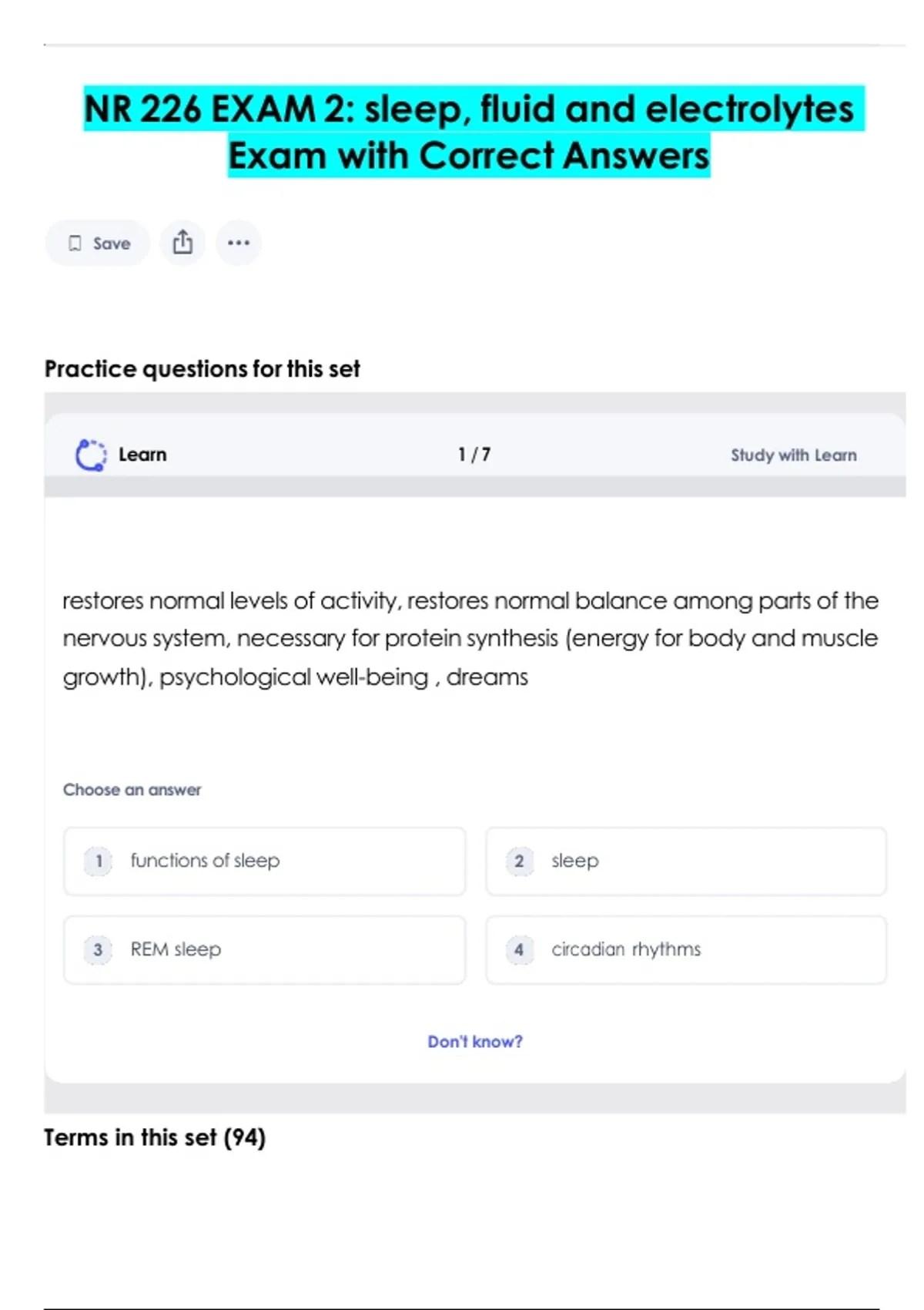 NR 226 EXAM 2: sleep, fluid and electrolytes Exam with Correct Answers