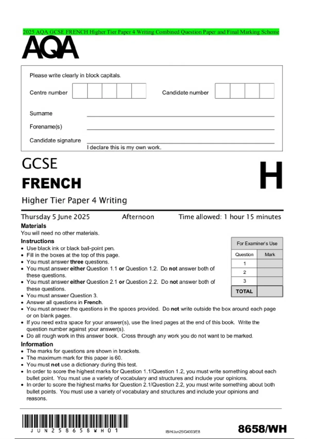 2025 AQA GCSE FRENCH Higher Tier Paper 4 Writing Combined Question Paper and Final Marking Scheme