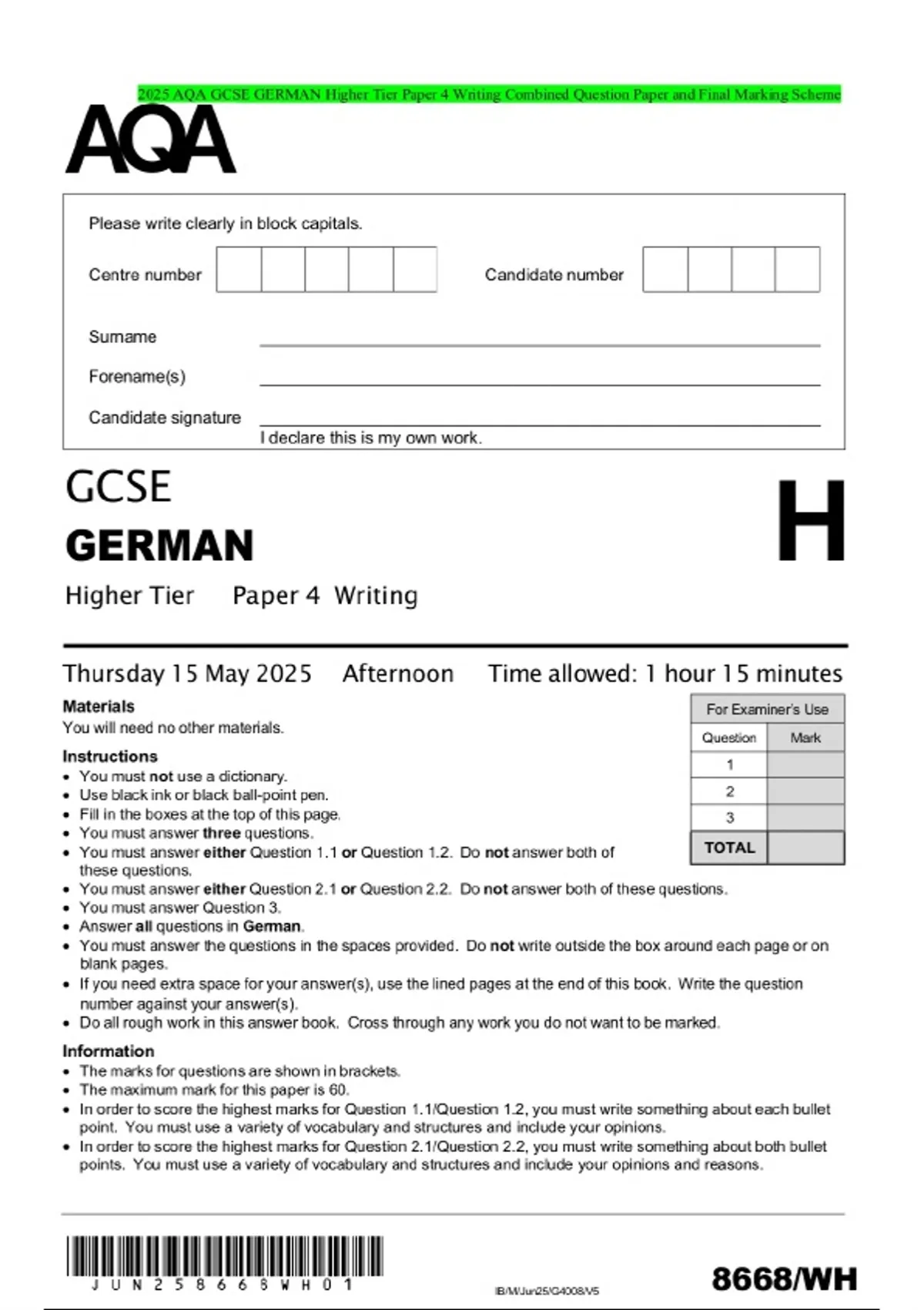 2025 AQA GCSE GERMAN Higher Tier Paper 4 Writing Combined Question Paper and Final Marking Scheme