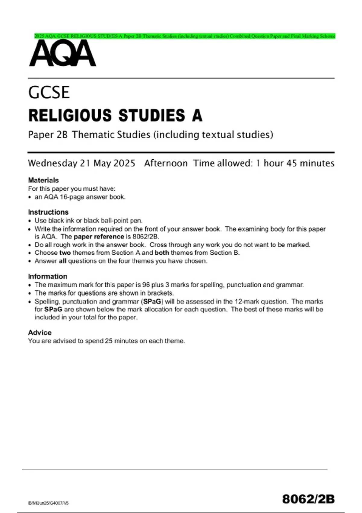 2025 AQA GCSE RELIGIOUS STUDIES A Paper 2B Thematic Studies (including textual studies) Combined Question Paper and Final Marking Scheme