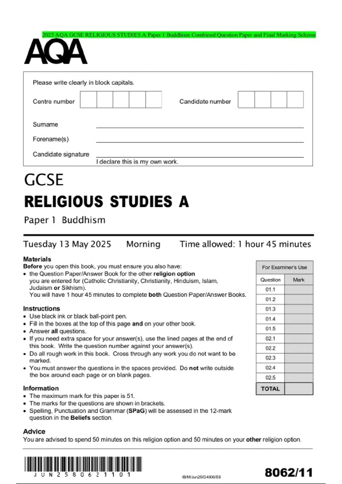 2025 AQA GCSE RELIGIOUS STUDIES A Paper 1 Buddhism Combined Question Paper and Final Marking Scheme