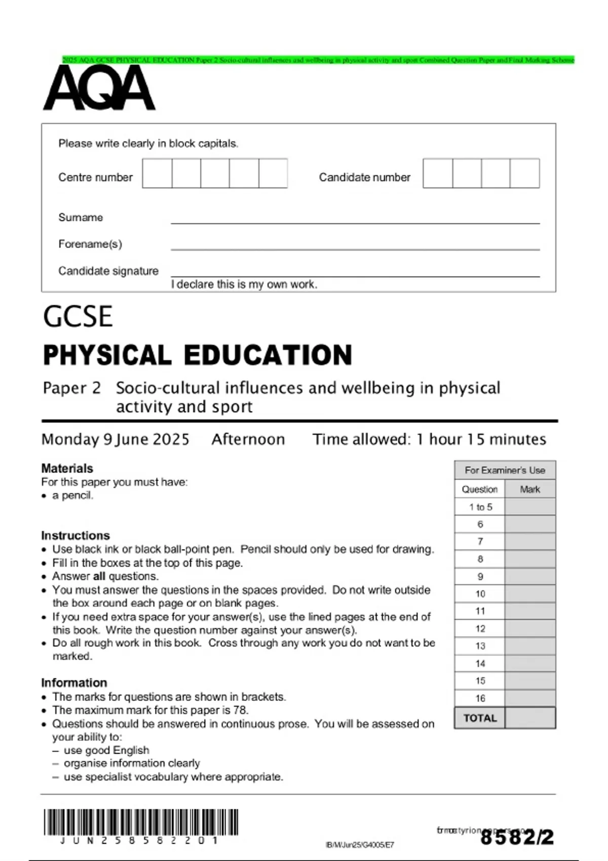 2025 AQA GCSE PHYSICAL EDUCATION Paper 2 Socio-cultural influences and wellbeing in physical activity and sport Combined Question Paper and Final Marking Scheme