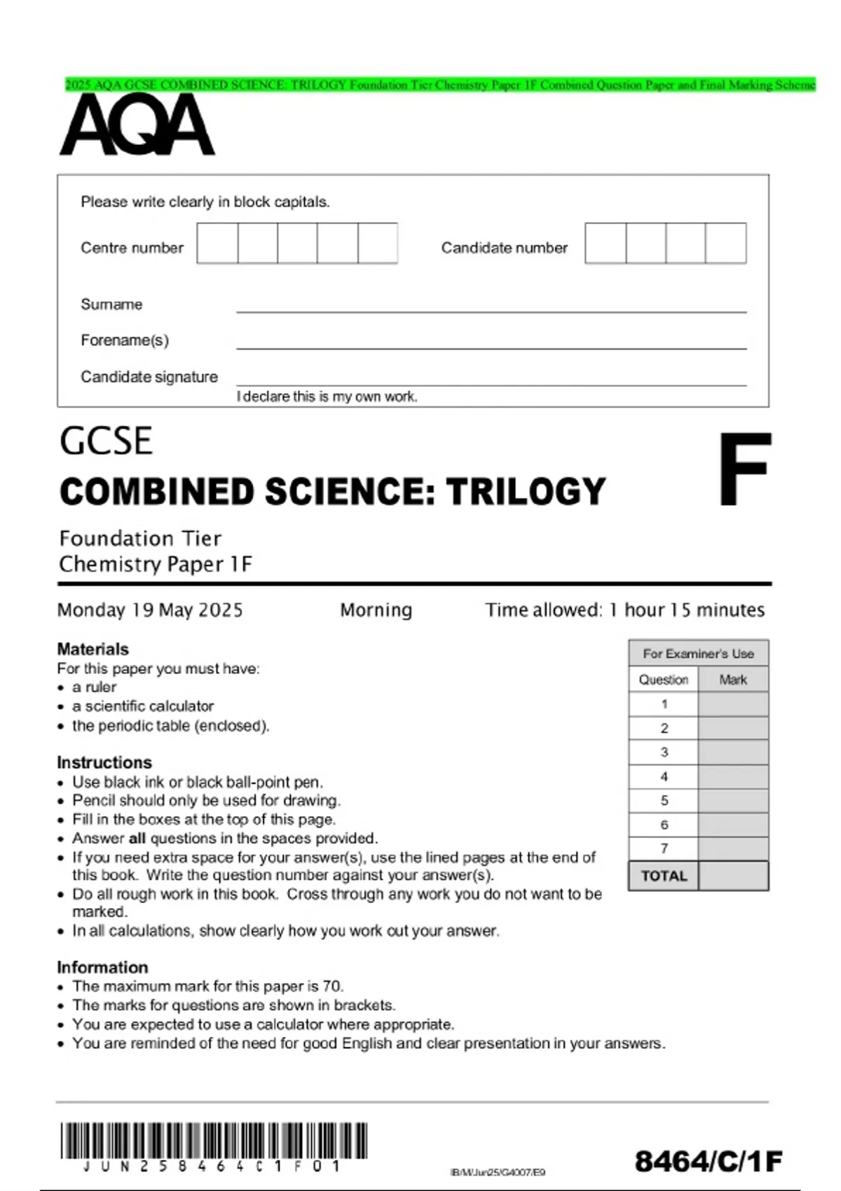 2025 AQA GCSE COMBINED SCIENCE: TRILOGY Foundation Tier Chemistry Paper 1F Combined Question Paper and Final Marking Scheme