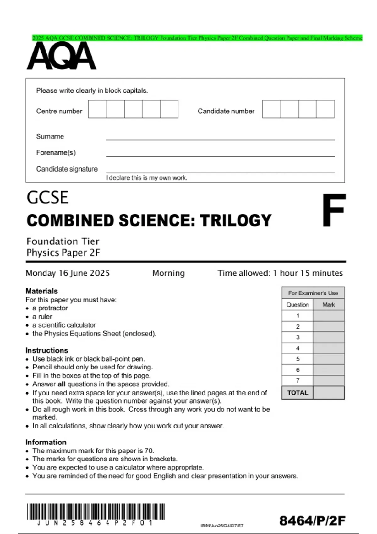 2025 AQA GCSE COMBINED SCIENCE: TRILOGY Foundation Tier Physics Paper 2F Combined Question Paper and Final Marking Scheme