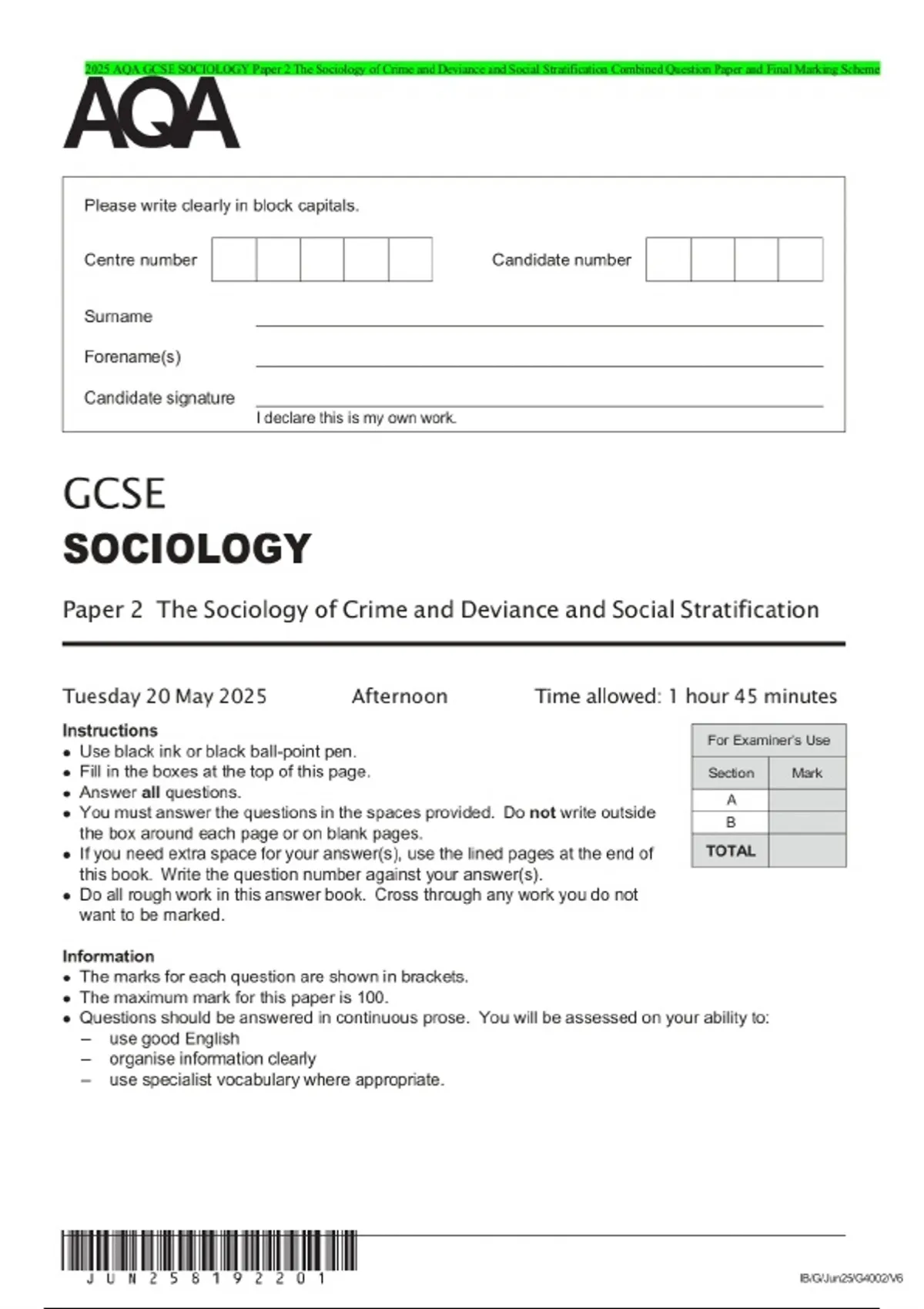 2025 AQA GCSE SOCIOLOGY Paper 2 The Sociology of Crime and Deviance and Social Stratification Combined Question Paper and Final Marking Scheme