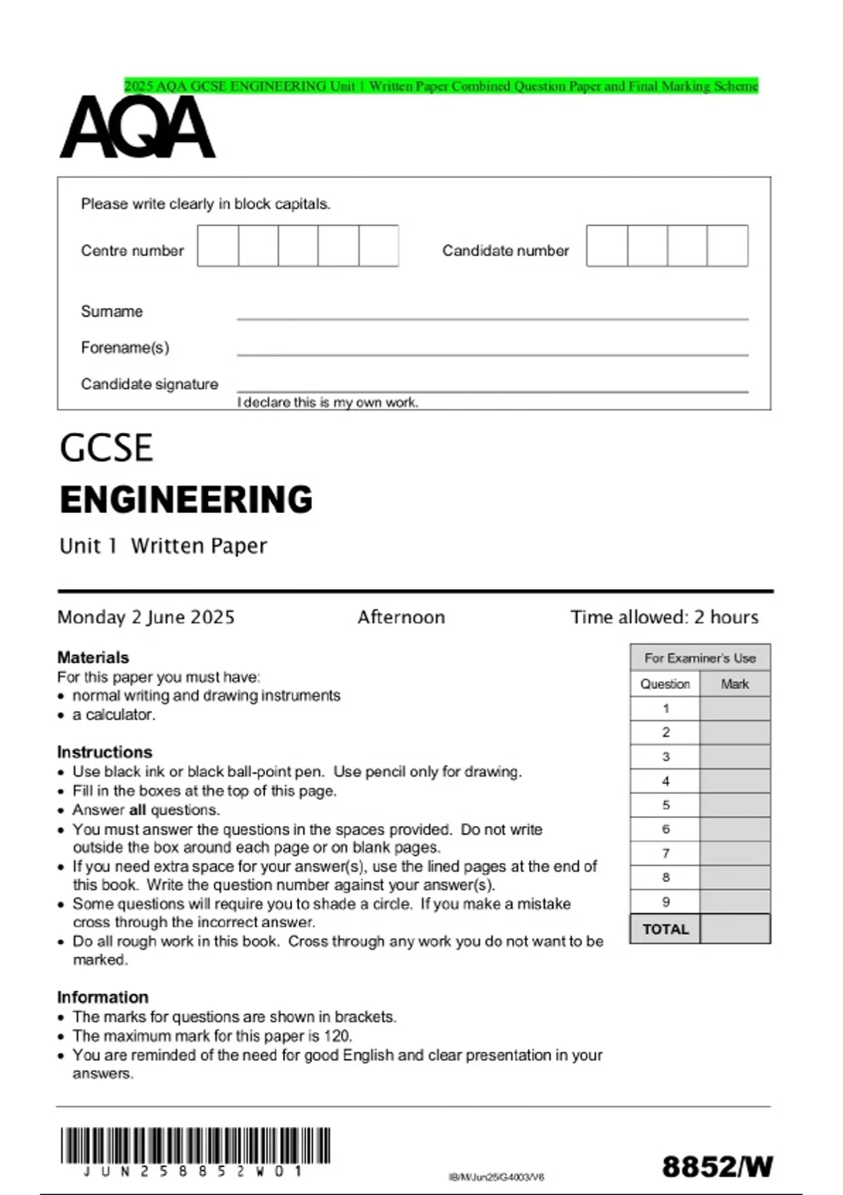 2025 AQA GCSE ENGINEERING Unit 1 Written Paper Combined Question Paper and Final Marking Scheme