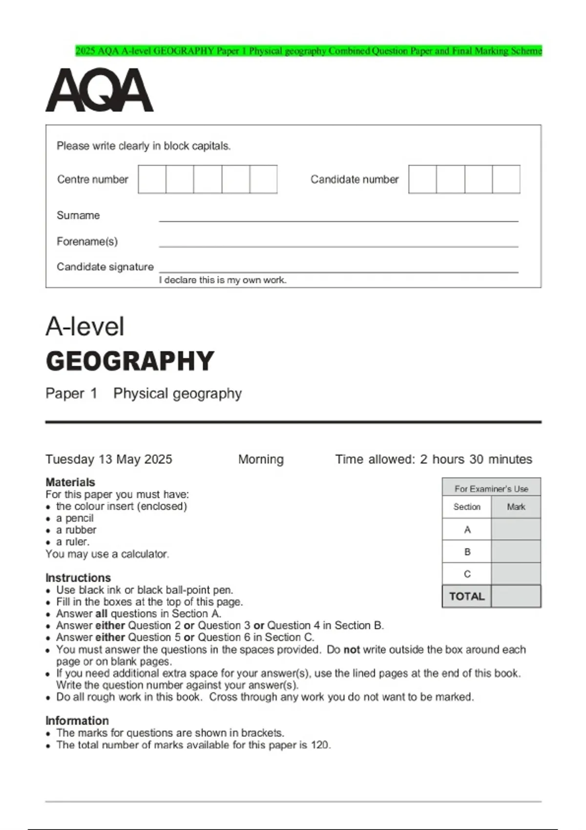 2025 AQA A-level GEOGRAPHY Paper 1 Physical geography Combined Question Paper and Final Marking Scheme