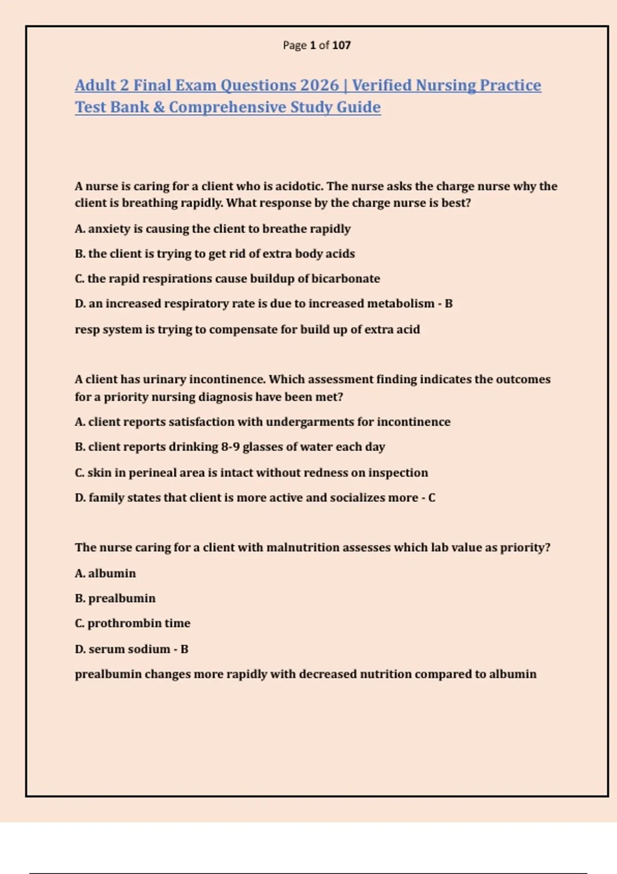 Adult 2 Final Exam Questions 2026 | Verified Nursing Practice Test Bank & Comprehensive Study Guide