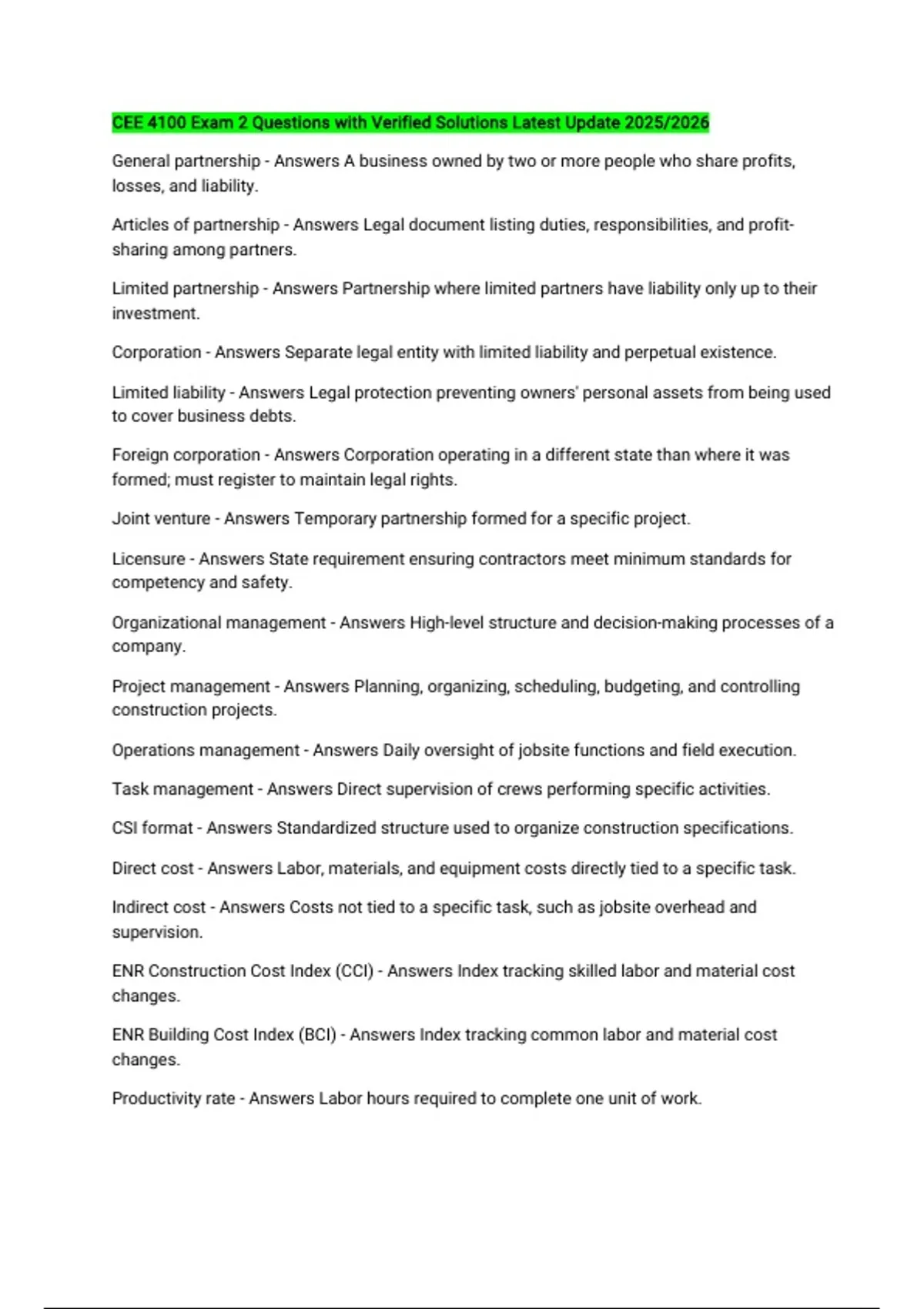 CEE 4100 Exam 2 Questions with Verified Solutions Latest Update 2025/2026 General partnership - Answers A business owned by two or more people who share profits, losses, and liability. Articles of partnership - Answers Legal document listing duties, responsibilities, and profit-sharing among partners. Limited partnership - Answers Partnership where limited partners have liability only up to their investment. Corporation - Answers Separate legal entity with limited liability and perpetual existence. Limited liability - Answers Legal protection preventing owners' personal assets from being used to cover business debts. Foreign corporation - Answers Corporation operating in a different state than where it was formed; must register to maintain legal rights. Joint venture - Answers Temporary partnership formed for a specific project. Licensure - Answers State requirement ensuring contractors meet minimum standards for competency and safety. Organizational management - Answers High-level structure and decision-making processes of a company. Project management - Answers Planning, organizing, scheduling, budgeting, and controlling construction projects. Operations management - Answers Daily oversight of jobsite functions and field execution. Task management - Answers Direct supervision of crews performing specific activities. CSI format - Answers Standardized structure used to organize construction specifications. Direct cost - Answers Labor, materials, and equipment costs directly tied to a specific task. Indirect cost - Answers Costs not tied to a specific task, such as jobsite overhead and supervision. ENR Construction Cost Index (CCI) - Answers Index tracking skilled labor and material cost changes. ENR Building Cost Index (BCI) - Answers Index tracking common labor and material cost changes. Productivity rate - Answers Labor hours required to complete one unit of work. Work hours required - Answers Total labor hours needed for a task based on productivity. Activity duration - Answers Time required to complete an activity based on work hours and crew size. Equipment owning cost - Answers Long-term cost including depreciation, insurance, and interest. Equipment operating cost - Answers Cost of using equipment including fuel, maintenance, and operator wages. Mobilization cost - Answers Cost to move equipment to and from the jobsite. Allowance - Answers Budget placeholder for items not fully defined in the contract. Alternate - Answers Proposed substitute for a material or method that may affect price. Unbalanced bidding - Answers Setting artificially high or low unit prices to gain financial advantage. Responsive bid - Answers Bid that follows all requirements of the bid documents. Bid acceptance period - Answers Time during which the contractor must honor their submitted price. Unit price estimating - Answers Pricing based on unit costs multiplied by quantity. Bare cost - Answers Direct cost without overhead or profit. Overhead and profit (O&P) - Answers Markup added to bare cost for business expenses and earnings. Swell factor - Answers Increase in soil volume when excavated. Shrinkage factor - Answers Reduction in soil volume after compaction. OSHA - Answers Federal agency created in 1970 to enforce workplace safety standards. Fatal Four - Answers Top construction causes of death: falls, struck-by, caught-in/between, electrocution. Incident rate (TRIR) - Answers Safety metric comparing injuries to hours worked. Direct accident cost - Answers Immediate costs like medical treatment and workers' compensation. Indirect accident cost - Answers Hidden costs like delays, lost productivity, and damaged equipment. Recordable incident - Answers Workplace injury requiring more than first aid. Lost-workday incident - Answers Injury causing time off or restricted duty.
