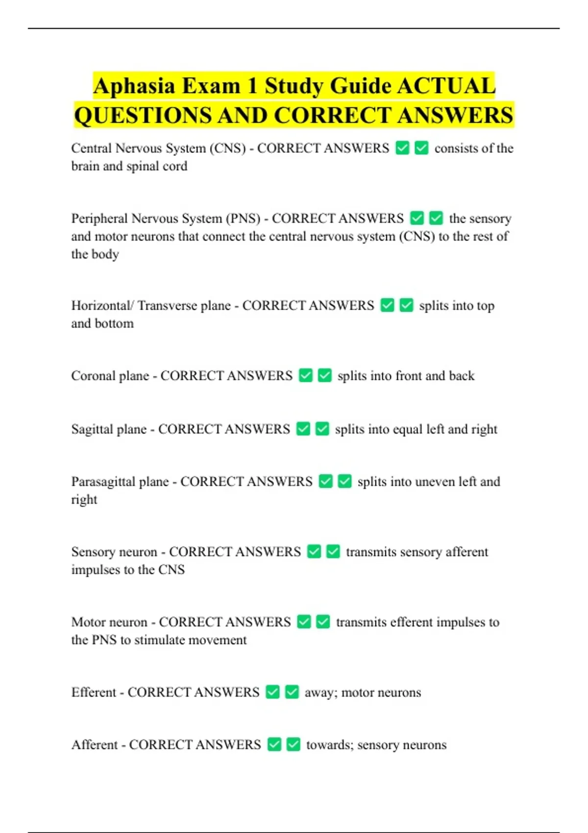 Aphasia Exam 1 Study Guide ACTUAL QUESTIONS AND CORRECT ANSWERS Structural and Functional unit of the nervous system - CORRECT ANSWERS Neuron Extension coming out from the cell that collects and transmits electrical impulse toward the cell body - CORRECT ANSWERS Dendrites