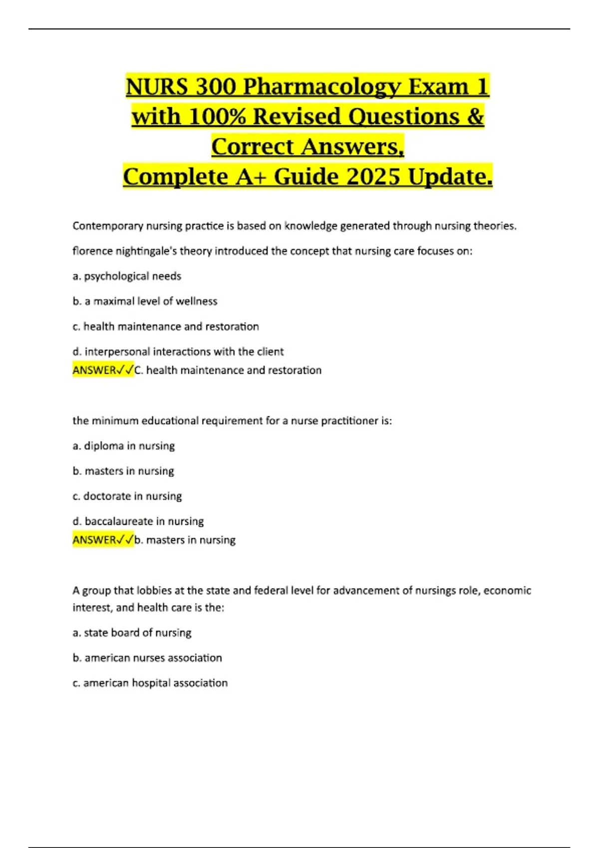NURS 300 Pharmacology Exam 1 with 100% Revised Questions & Correct Answers, Complete A+ Guide 2025 Update.