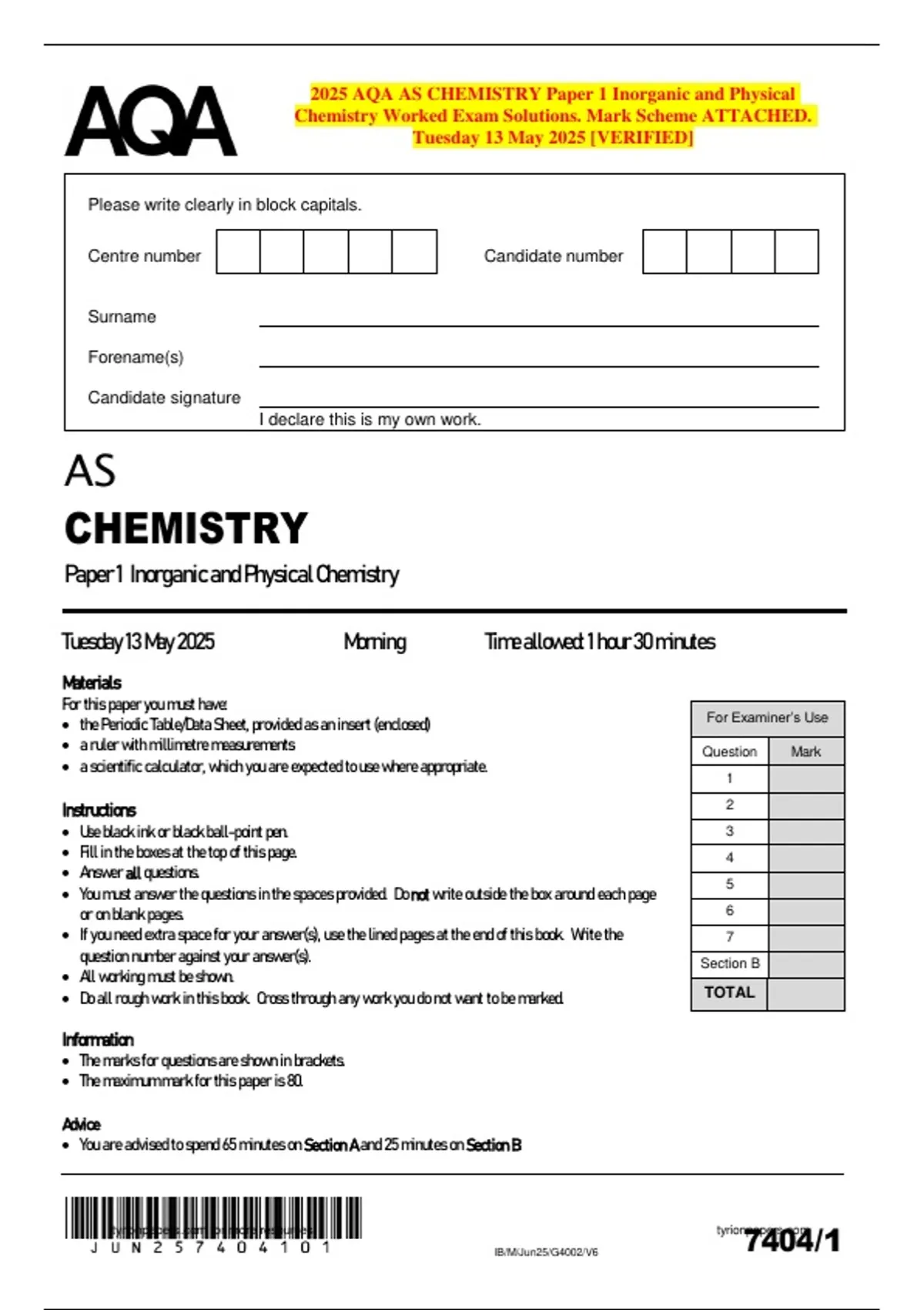 2025 AQA AS CHEMISTRY Paper 1 Inorganic and Physical Chemistry Worked Exam Solutions. Mark Scheme ATTACHED. Tuesday 13 May 2025 [VERIFIED] Please write clearly in block capitals. Centre number Surname Forename(s) Candidate number Candidate signature I declare this is my own work. AS CHEMISTRY Paper 1 Inorganic and Physical Chemistry Tuesday 13 May 2025 Morning Time allowed: 1 hour 30 minutes Materials For this paper you must have:  the Periodic Table/Data Sheet, provided as an insert (enclosed)  a ruler with millimetre measurements  a scientific calculator, which you are expected to use where appropriate. For Examiner’s Use Question Mark 1 Instructions  Use black ink or black ball-point pen.  Fill in the boxes at the top of this page.  Answer all questions.  You must answer the questions in the spaces provided. Do not write outside the box around each page or on blank pages.  If you need extra space for your answer(s), use the lined pages at the end of this book. Write the question number against your answer(s).  All working must be shown.  Do all rough work in this book. Cross through any work you do not want to be marked. Information  The marks for questions are shown in brackets.  The maximum mark for this paper is 80. Advice  You are advised to spend 65 minutes on Section A and 25 minutes on Section B. 2 3 4 5 6 7 Section B TOTAL 4m for more resources tyrion 7pap 4ers /1 IB/M/Jun25/G4002/V6 2 Do not write outside the for more resources IB/M/Jun25/7404/1 Section A Answer all questions in this section. box This question is about the extraction of titanium. The first stage in the extraction of titanium is the formation of titanium(IV) chloride, TiCl4 TiO2(s) + 2 C(s) + 2 Cl2(g) ⟶ TiCl4(l) + 2 CO(g) . Calculate the percentage atom econom