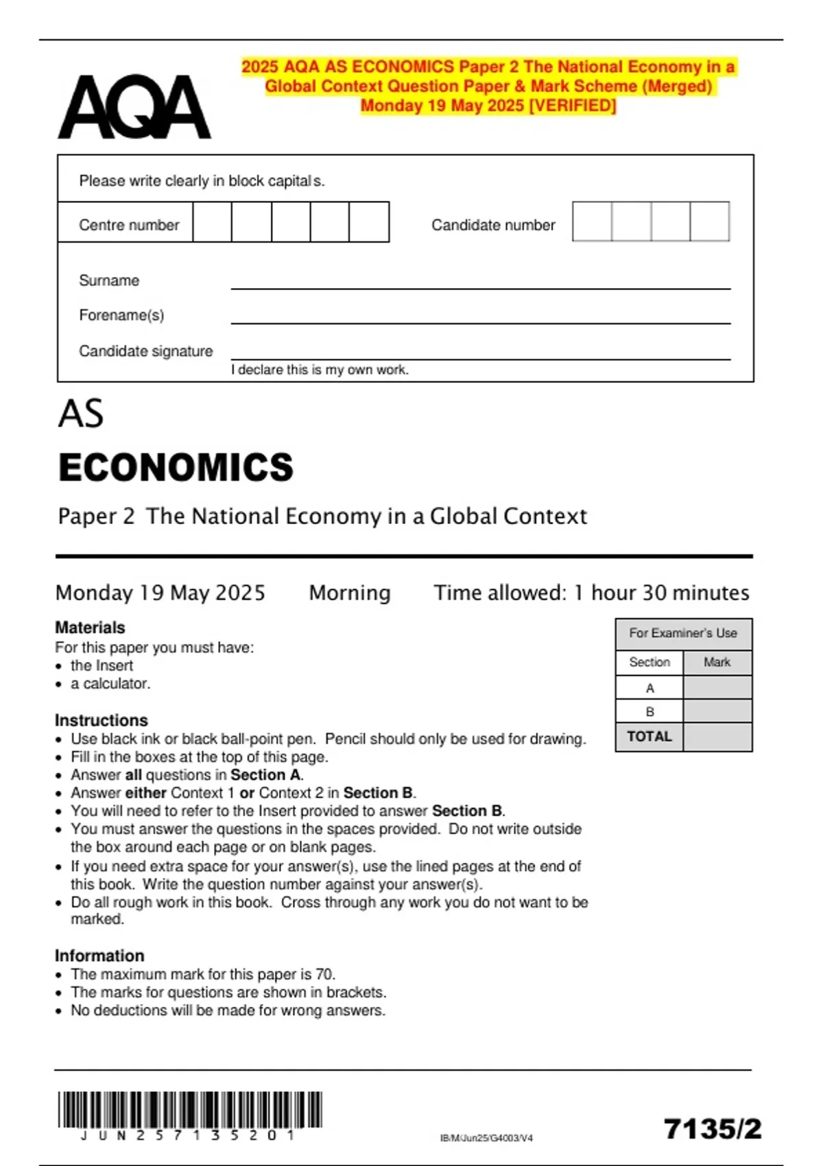The maximum mark for this paper is 70.