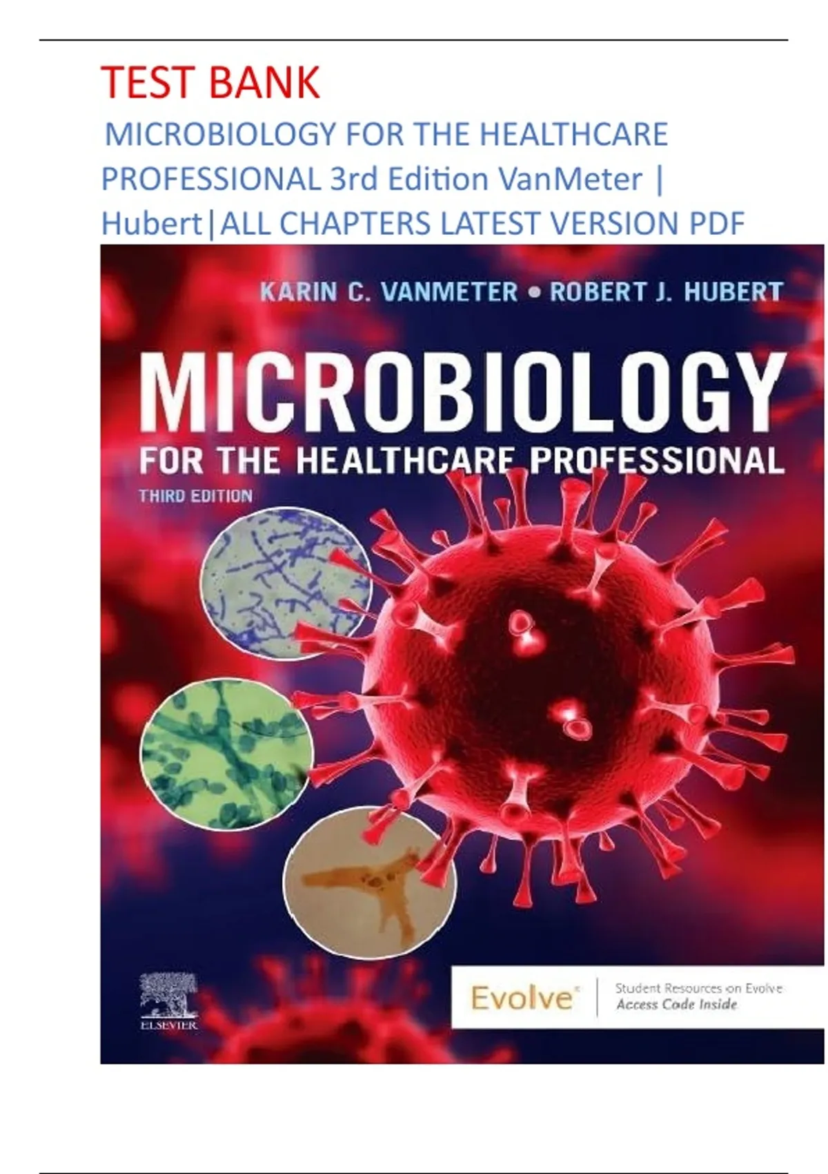 Test Bank Microbiology for the Healthcare Professional 3rd Edition By Karin C. VanMeter, Robert J. Hubert | Verified Chapter's 1 - 25 | Complete Newest Version Table of content 1. Scope of microbiology 2. Chemistry of life 3. Cell structure and function 4. Bacteria and archaea 5. Viruses 6. Eukaryotic microorganisms 7. Physical and chemical methods of control 8. Microbiological laboratory techniques 9. Microbiological laboratory safety issues 10. Pharmacology 11. Antimicrobial drugs 12. Infection and disease 13. The immune response and lymphatic system 14. Infections of the integumentary system, soft tissue, and musculoskeletal system 15. Infections of the respiratory system 16. Infections of the gastrointestinal system 17. Infections of the nervous system and sensory structures 18. Infections of the cardiovascular and circulatory systems 19. Infections of the urinary system 20. Infections of the reproductive system 21. Sexually transmitted infections and diseases 22. Human age and microorganisms 23. Microorganisms in the environment and effects on human health 24. Emerging infectious diseases 25. Biotechnology Chapter 01: Scope of Microbiology VanMeter: Microbiology for the Healthcare Professional, 3rd Edition MULTIPLE CHOICE 1. In the sixteenth century a father-and-son team, by the name of , produced acompound microscope consisting of a simple tube with lenses at each end. a. van Leeuwenhoek b. Semmelweis c. Janssen d. Hooke ANS: C REF: p. 3 2. “Animalcules” were first described by a. Robert Hooke. b. Antony van Leeuwenhoek. c. Hans Janssen. d. John Needham. ANS: B REF: p. 3 PDF