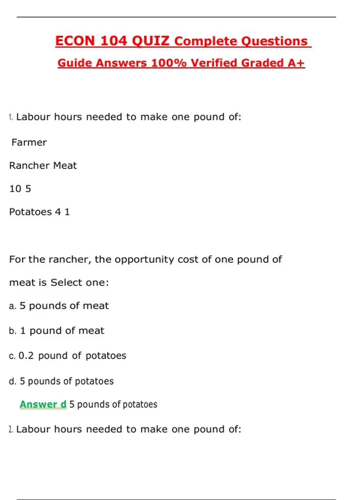 ECON 104 Quiz (Latest 2025/2026 Update) Complete Questions and Guide Answers, 100% Verified Graded A+ Maximize your score on the ECON 104 Quiz with this complete, fully updated PDF study guide. Designed for college students and exam candidates, this instant downloadable resource includes all quiz questions, correct answers, and detailed explanations, helping you excel in every module and topic. This printable and mobile-friendly PDF provides efficient self-study and last-minute review, covering microeconomics, macroeconomics, supply and demand, market structures, consumer behavior, fiscal and monetary policies, international trade, and economic indicators. Stay prepared, confident, and exam-ready with high-yield, exam-focused content. ECON 104 quiz, ECON 104 study guide, ECON 104 practice test, microeconomics quiz, macroeconomics quiz, supply and demand practice questions, economic indicators quiz, fiscal and monetary policy review, international trade exam, ECON 104 answers, college economics quiz prep, instant PDF download ECON 104, ECON 104 exam questions, ECON 104 practice PDF, economics quiz 2026