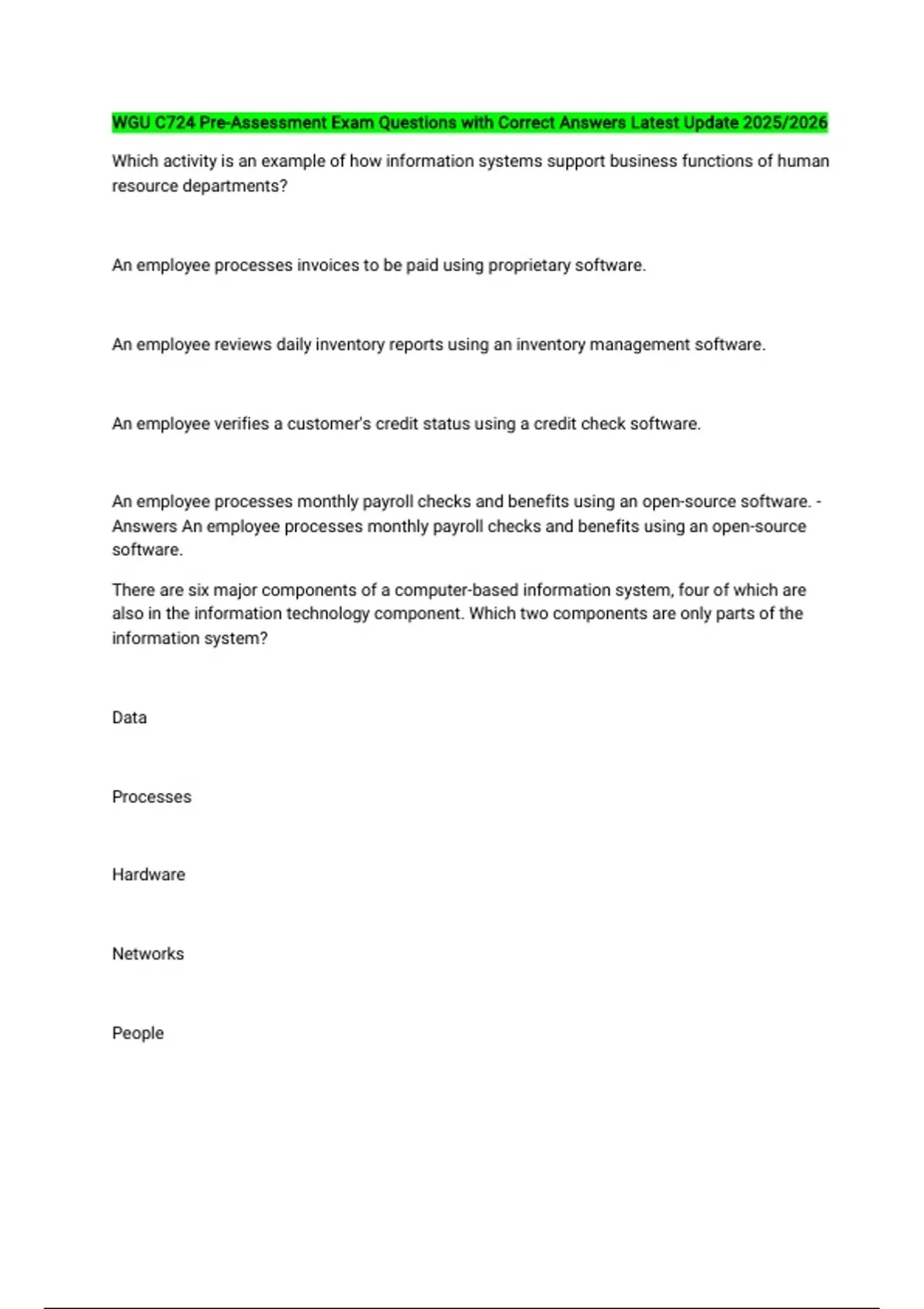 WGU C724 Pre-Assessment Exam Questions with Correct Answers Latest Update 2025/2026 Which activity is an example of how information systems support business functions of human resource departments? An employee processes invoices to be paid using proprietary software. An employee reviews daily inventory reports using an inventory management software. An employee verifies a customer's credit status using a credit check software. An employee processes monthly payroll checks and benefits using an open-source software. - Answers An employee processes monthly payroll checks and benefits using an open-source software. There are six major components of a computer-based information system, four of which are also in the information technology component. Which two components are only parts of the information system? Data Processes Hardware Networks People Software - Answers Processes People A police department at a large metropolitan city implemented an information system that analyzes historical crime data, including date and locations as well as other external, environmental, and city-related data. The system then produces daily predictive reports of the major locations around the city that are likely to require additional police attention. The police department uses the reports to plan the officers' patrol routes, targeting the areas that the system predicted to have high likelihood of incidents. Which type of computer-based information system provides a competitive advantage based on the described scenario? A decision support system (DSS) that improves decision-making A transaction processing system (TPS) that promotes product differentiation A geographic information system (GIS) that helps increase market share A management information system (MIS) that enhances the customer experience - Answers A decision support system (DSS) that improves decision-making A police department at a large metropolitan city implemented an information system that integrates historical crime data, including date and locations to other external, environmental, and city-related data. The system then produces daily predictive reports of the major locations around the city that are likely to require additional police attention. The police department uses the reports to plan the officers' patrol routes, targeting the areas that the system predicted to have high likelihood of incidents. Which two strategies does the information system at the police department aim to accomplish? Choose 2 answers Customer satisfaction Operational efficiency Product differentiation Cost saving Improving decision-making - Answers Operational efficiency Improving decision-making Which business function is primarily the responsibility of production and operations information systems? Recruiting and training Product pricing Quality control Accounts payable - Answers Quality control A small company that is growing quickly into a medium-sized company is facing the challenge of consolidating and storing information received from multiple sources from the ground up in order to ensure that operations run efficiently. The company needs to hire an expert who will, in addition to the above, maintain security and apply upgrades as needed. Which IT professional does the company need to hire in order to address this challenge? Chief technology officer Computer programmer Database administrator Web developer - Answers Database administrator A university is looking for ways to customize its courses to the unique needs of its students by creating various levels of hybrid online courses, such as 80% online for one student, whereas only 30% online for another. Which IT management challenge is addressed in this scenario? Achieve operational excellence Develop new products and services