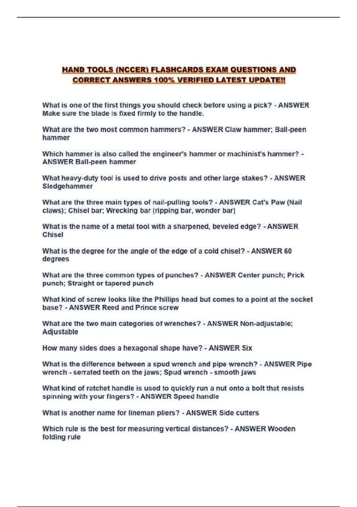HAND TOOLS (NCCER) FLASHCARDS EXAM QUESTIONS AND CORRECT ANSWERS 100% VERIFIED LATEST UPDATE!!...