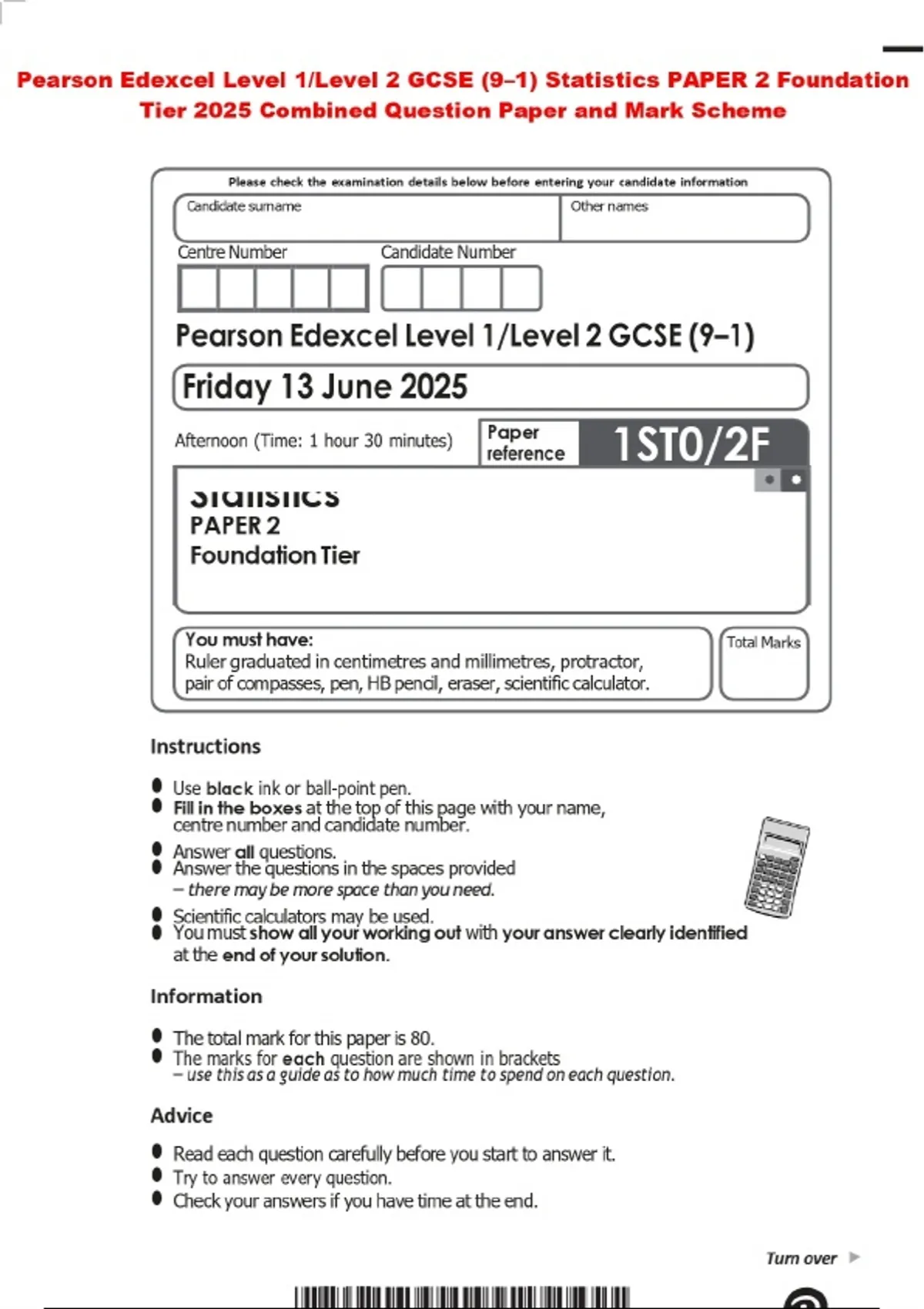 Pearson Edexcel Level 1/Level 2 GCSE (9–1) Statistics PAPER 2 Foundation Tier 2025 Combined Question Paper and Mark Scheme