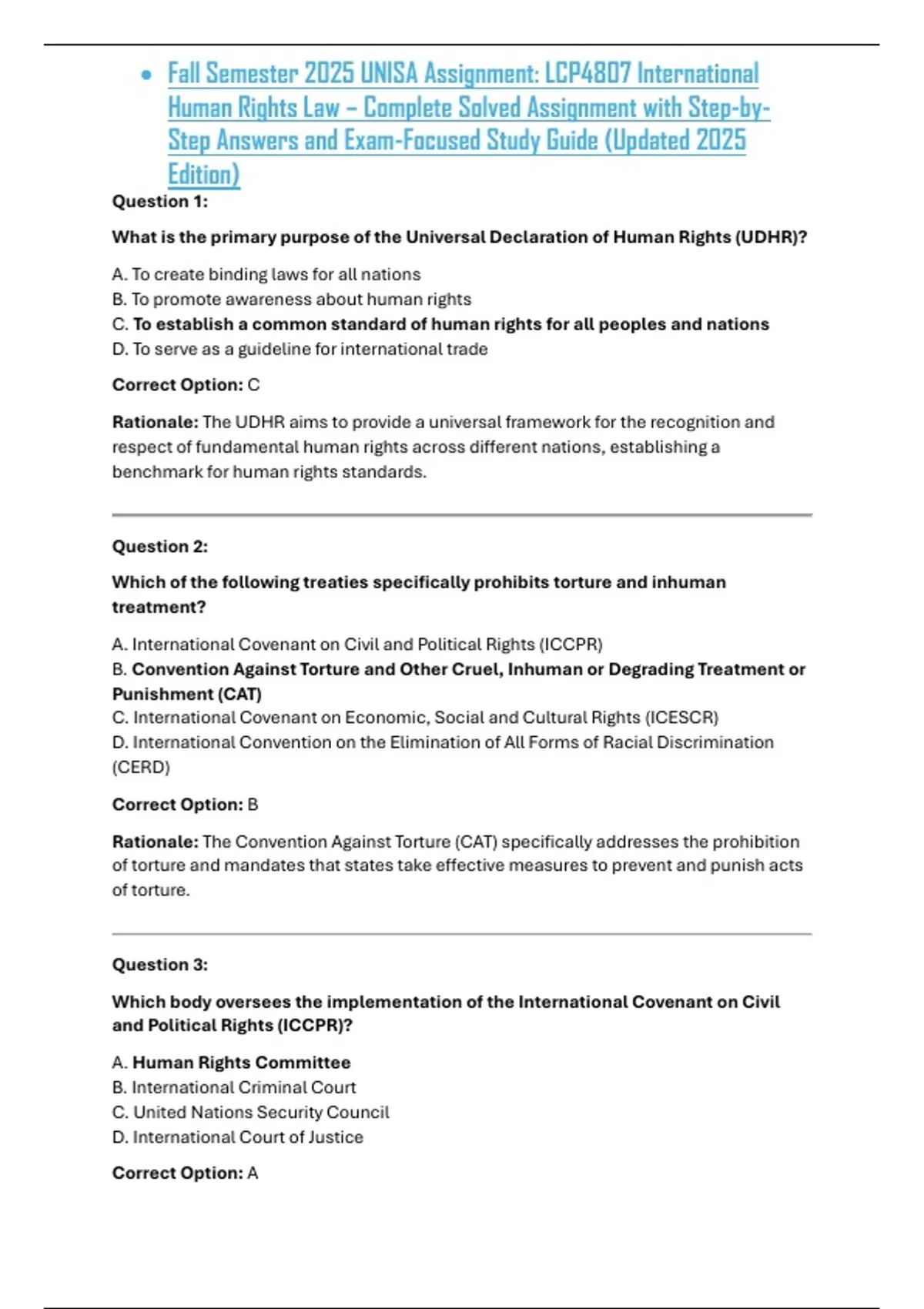 This Fall Semester 2025 UNISA LCP4807 International Human Rights Law assignment provides a fully solved, exam-focused resource aligned with the latest UNISA curriculum. Updated for 2025, it covers essential topics including international human rights frameworks, treaties and conventions, landmark case law, enforcement mechanisms, and the role of international organizations, presented through clear step-by-step answers and structured explanations. Designed to support effective revision, confident assignment completion, and thorough exam preparation, this guide helps students master human rights law principles and achieve higher marks in both assignments and examinations.