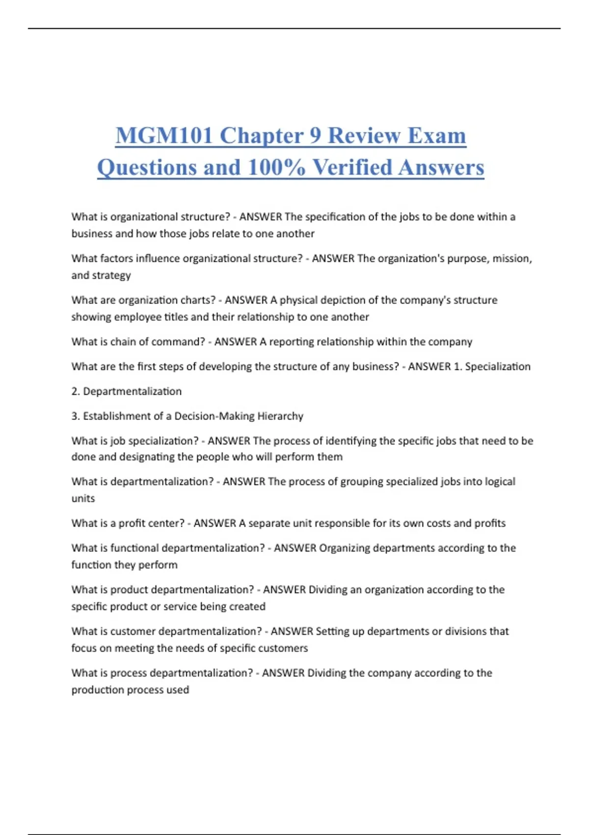 MGM101 Chapter 9 Review Exam Questions and 100% Verified Answers