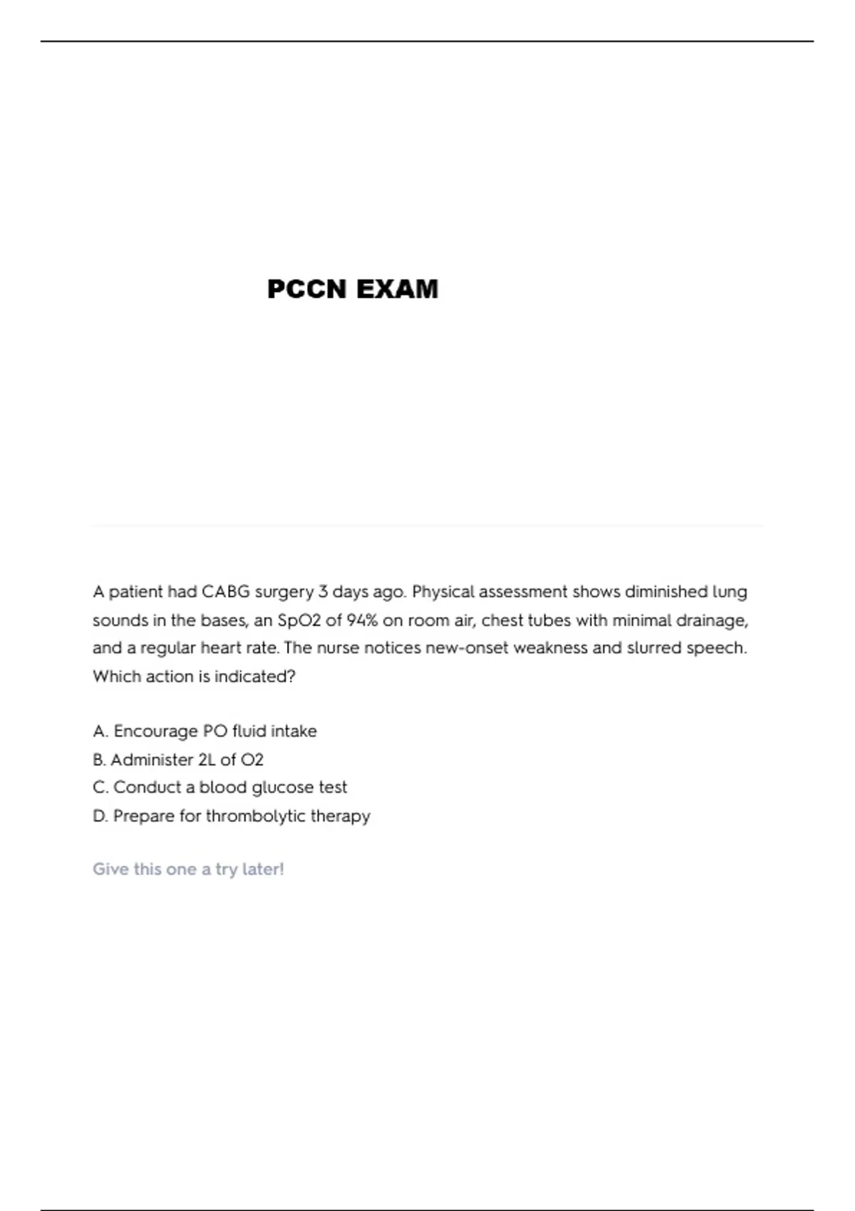 and a regular heart rate. The nurse notices new-onset weakness and slurred speech.