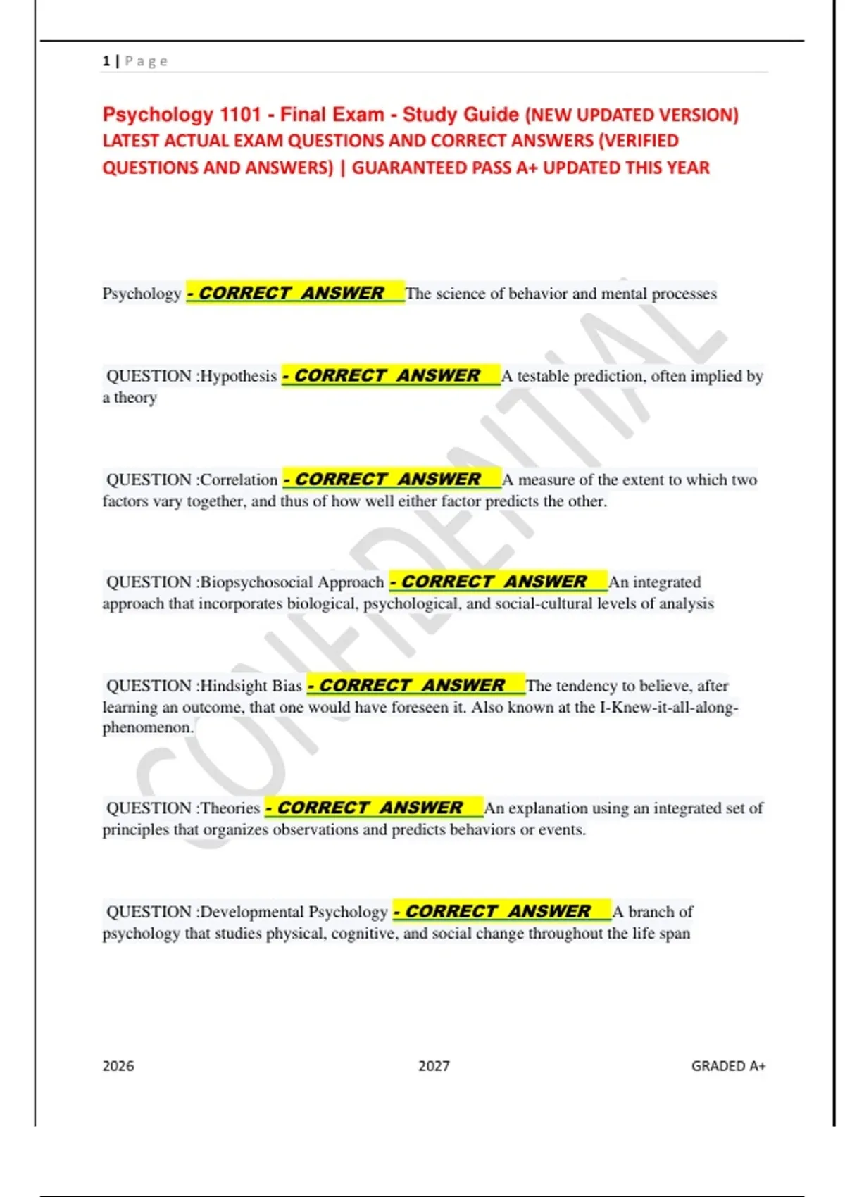 Psychology 1101 - Final Exam - Study Guide (NEW UPDATED VERSION) LATEST ACTUAL EXAM QUESTIONS AND CORRECT ANSWERS (VERIFIED QUESTIONS AND ANSWERS) | GUARANTEED PASS A+ UPDATED THIS YEAR