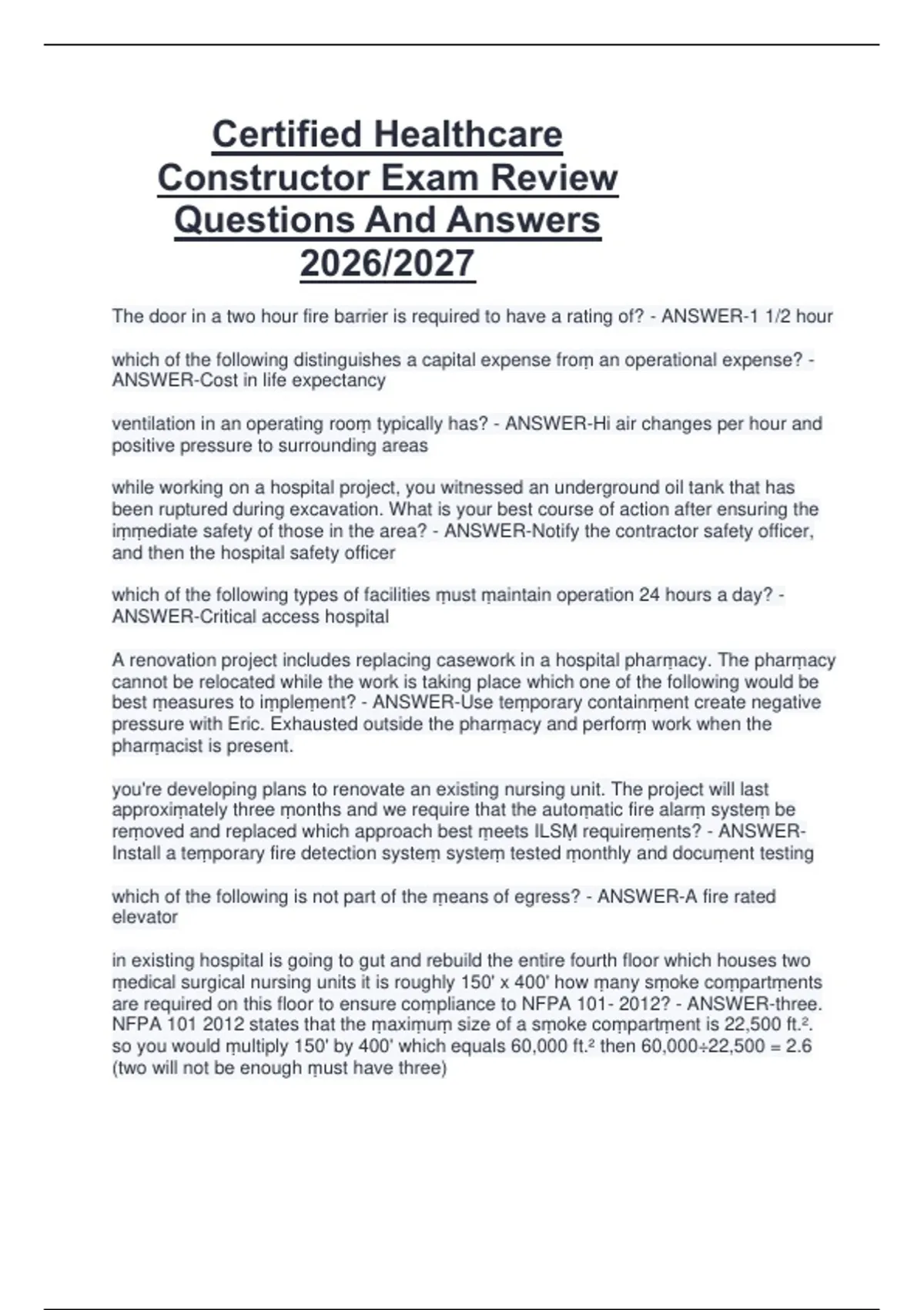 This exam review document includes targeted review questions and answers for the Certified Healthcare Constructor (CHC) exam, focusing on the key concepts tested in the 2026/2027 exam cycle. It helps reinforce understanding of healthcare construction standards, safety, codes, and project management. The content is well suited for final exam revision and knowledge consolidation.