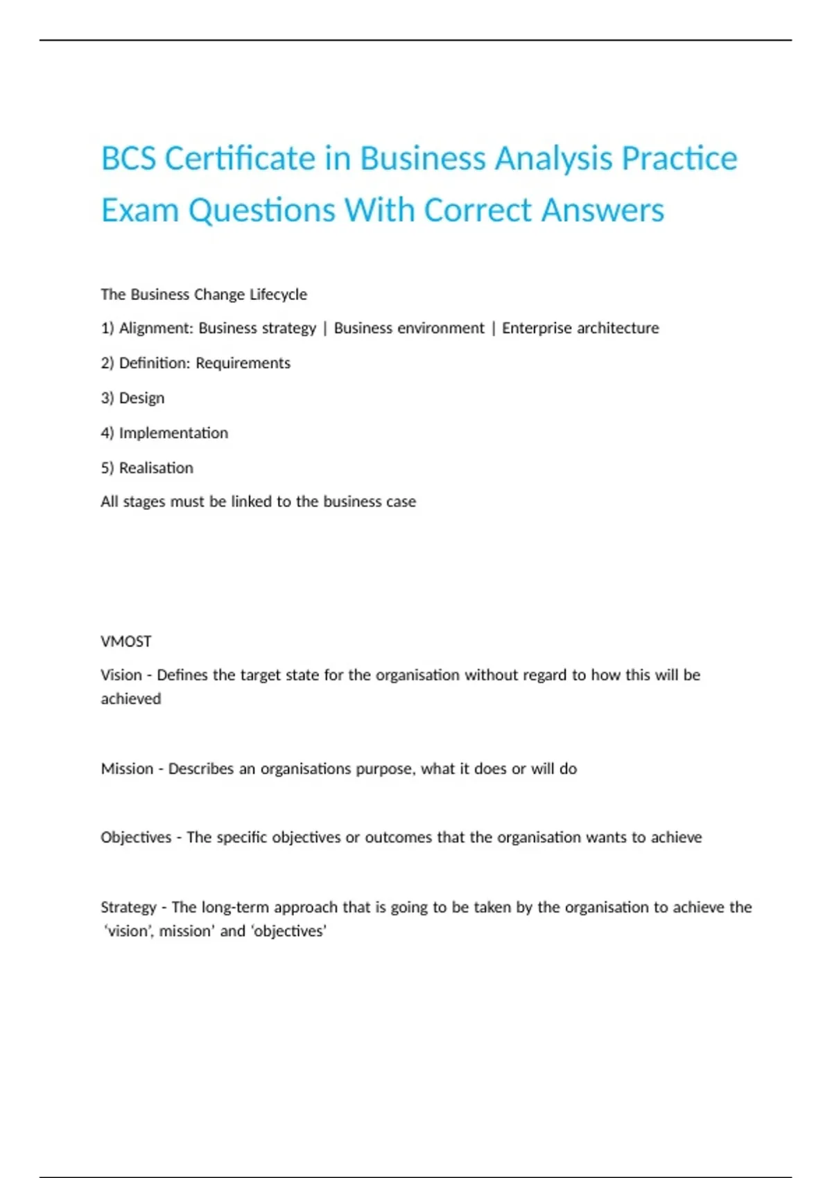 BCS Certificate in Business Analysis Practice Exam Questions With Correct Answers
