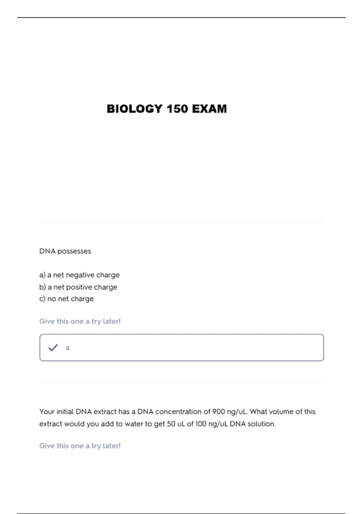 Your initial DNA extract has a DNA concentration of 900 ng/uL. What volume of this