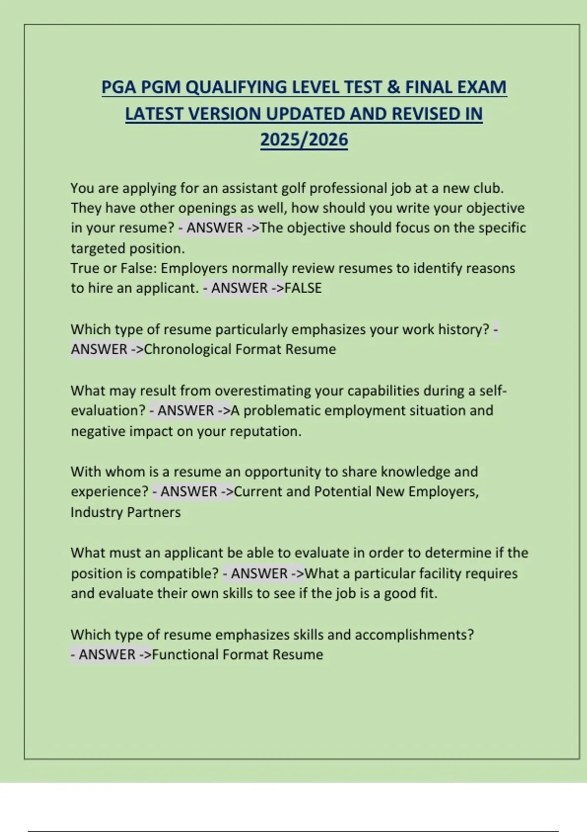 PGA PGM QUALIFYING LEVEL TEST & FINAL EXAM