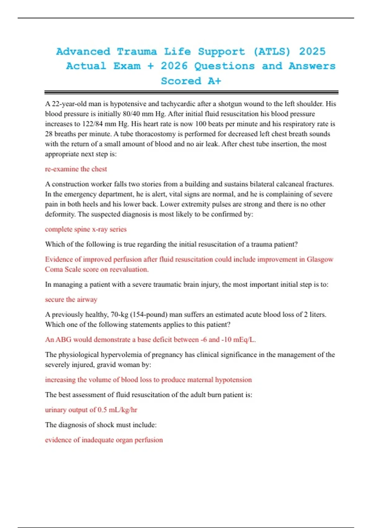 Advanced Trauma Life Support (ATLS) 2025 Actual Exam + 2026 Questions and Answe rs Scored A+ Advanced Trauma Life Support (ATLS) 2025 Actual Exam + 2026 Questions and Answe rs Scored A+