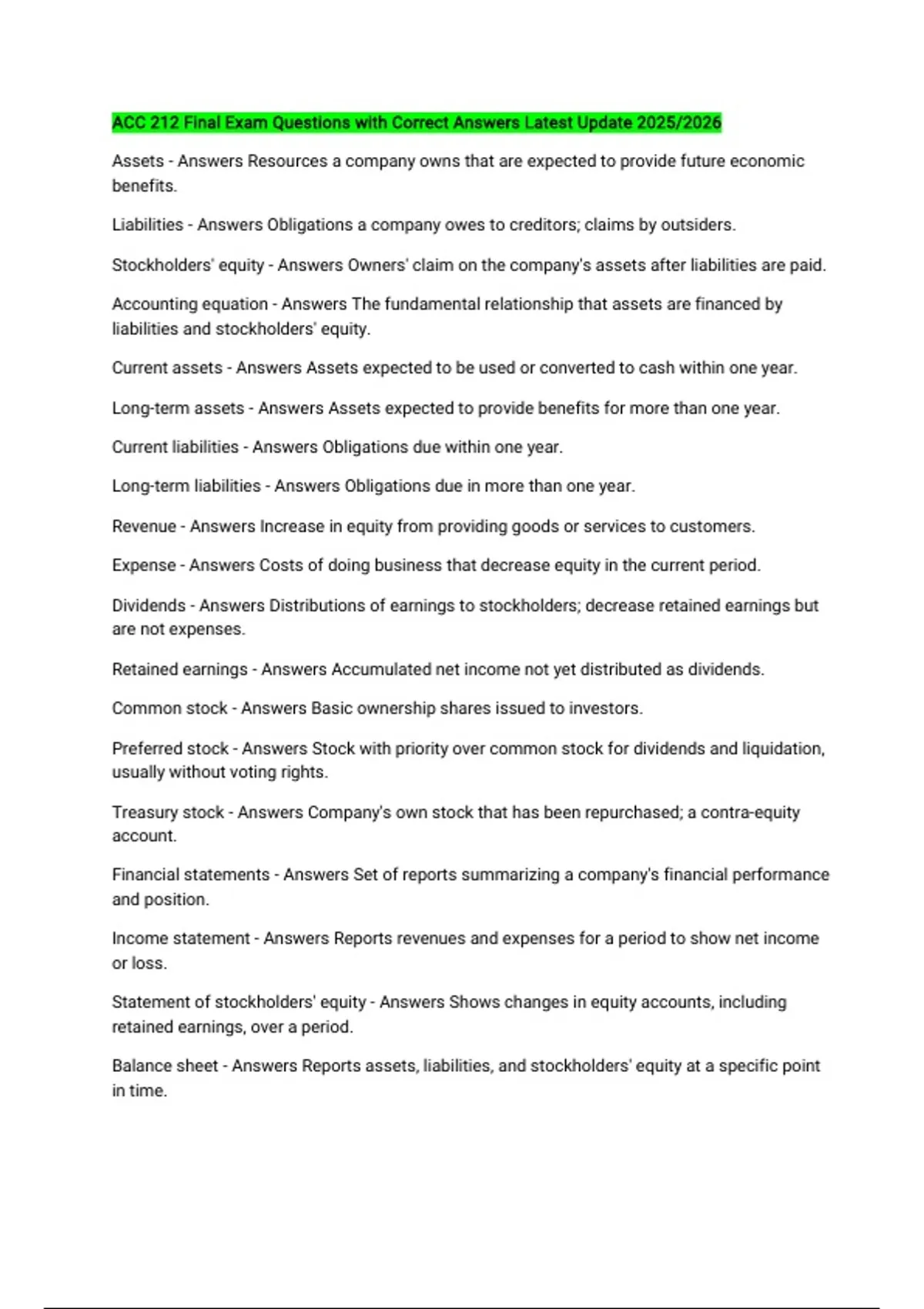 Stockholders' equity - Answers Owners' claim on the company's assets after liabilities are paid.