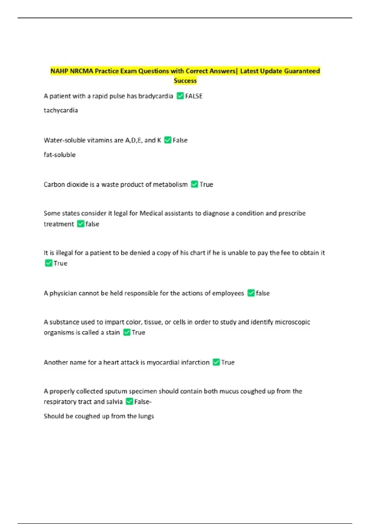 NAHP NRCMA Practice Exam Questions with Correct Answers| Latest Update Guaranteed Success
