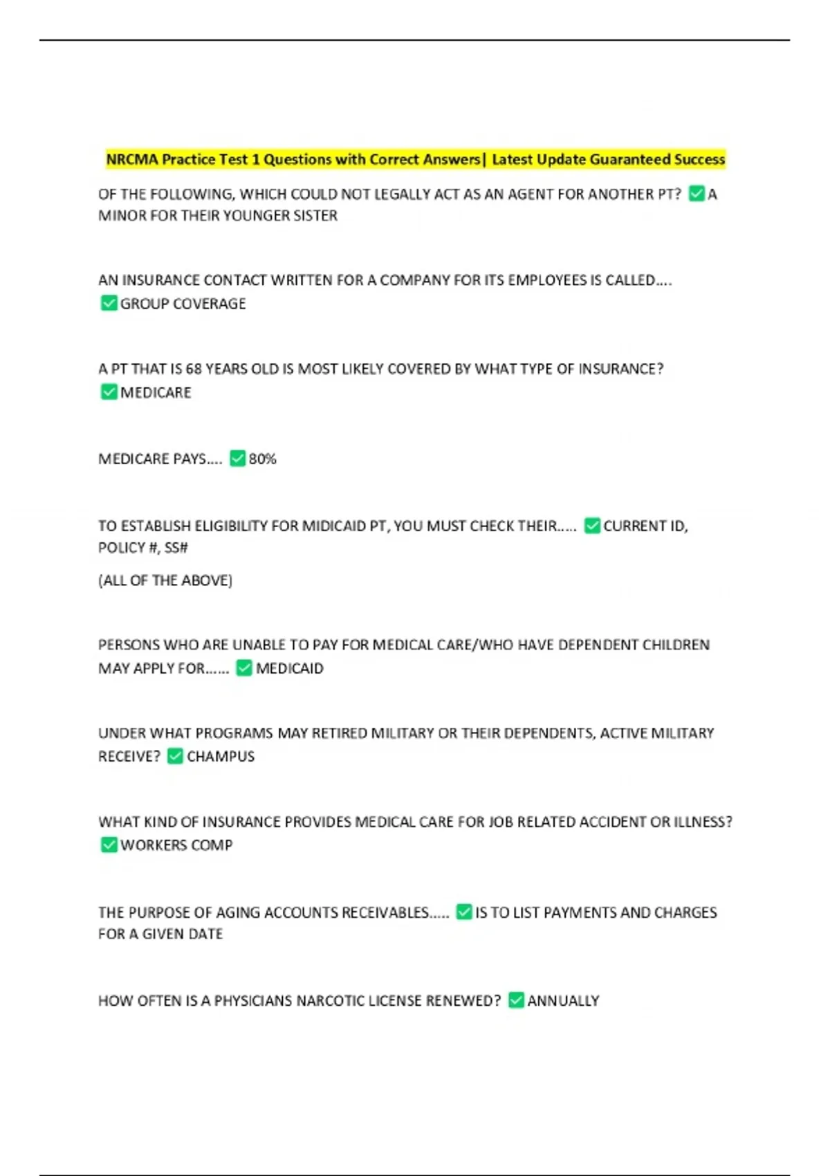 NRCMA Practice Test 1 Questions with Correct Answers| Latest Update Guaranteed Success