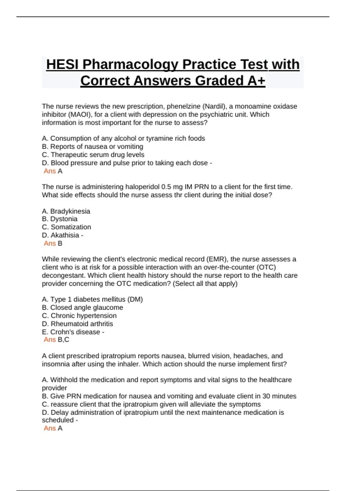 HESI Pharmacology Practice Test with Correct Answers Graded A+.