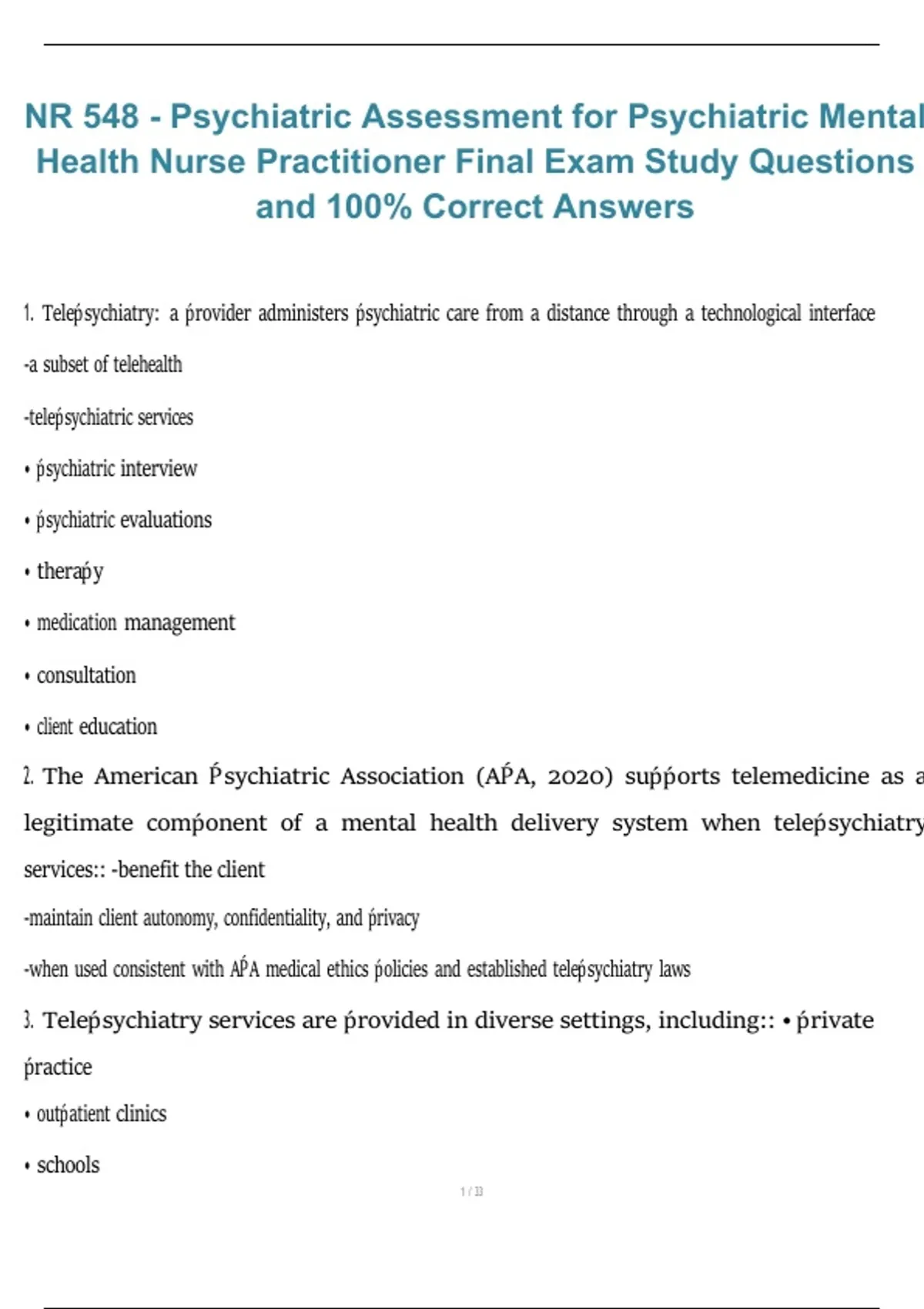 This document contains final exam study questions for NR548 Psychiatric Assessment for the Psychiatric Mental Health Nurse Practitioner program. It focuses on comprehensive psychiatric assessment, interview techniques, mental status examination, and diagnostic evaluation, with verified correct answers aligned to the 2026/2027 academic year.