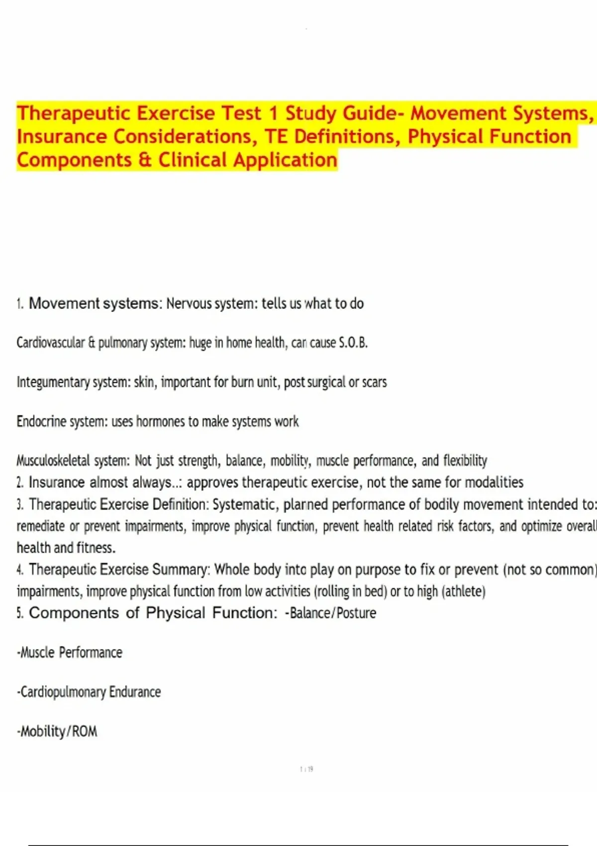 Therapeutic Exercise Test 1 Study Guide- Movement Systems, Insurance Considerations, TE Definitions, Physical Function Components & Clinical Application.pdf