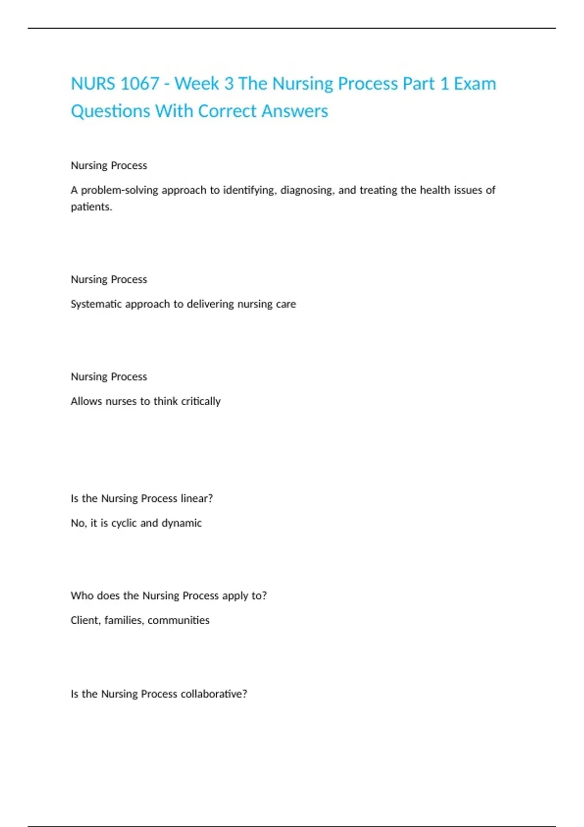 NURS 1067 - Week 3 The Nursing Process Part 1 Exam Questions With Correct Answers