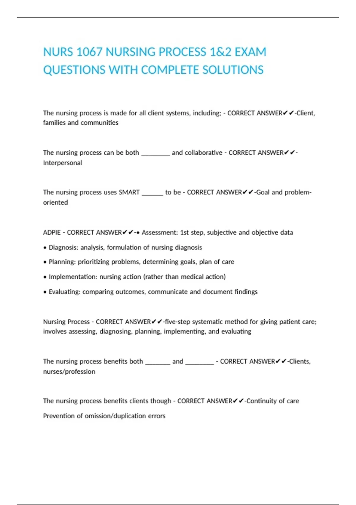 ADPIE |- |CORRECT |ANSWER✔✔-• |Assessment: |1st |step, |subjective |and |objective |data