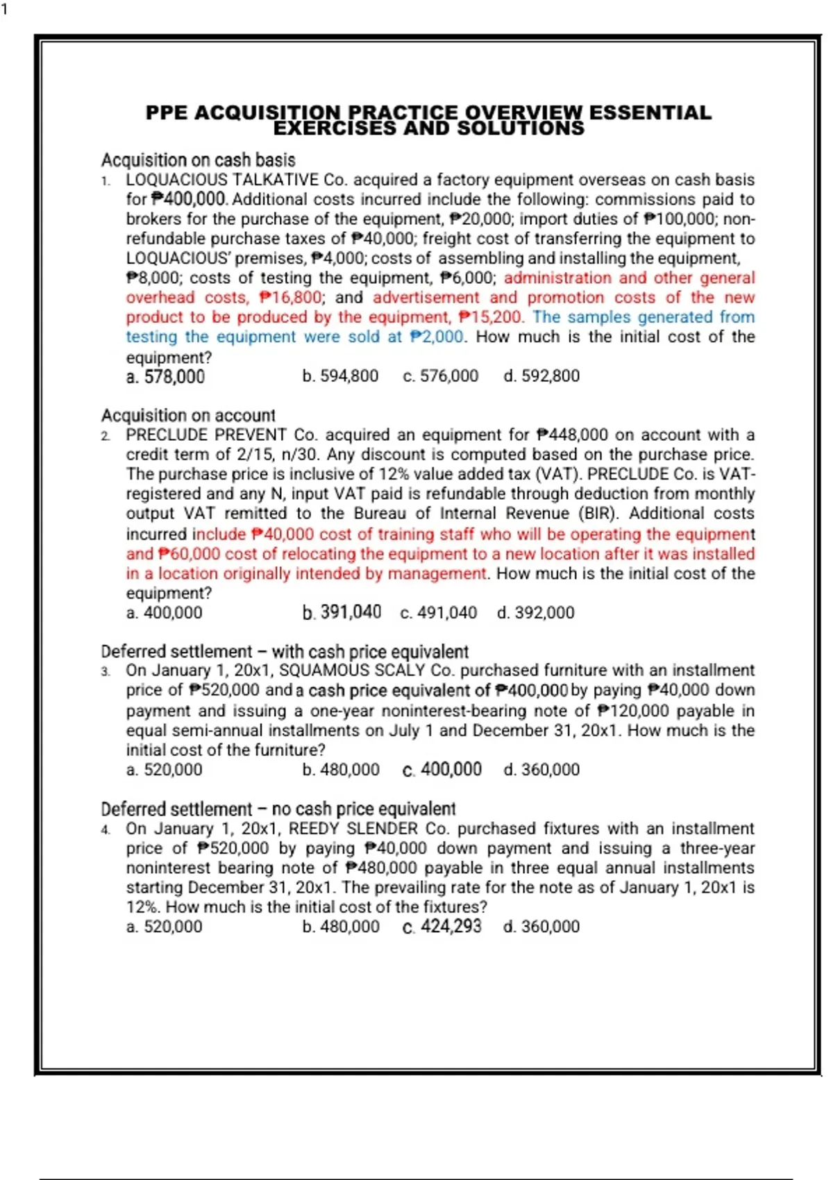 1. LOQUACIOUS TALKATIVE Co. acquired a factory equipment overseas on cash basis